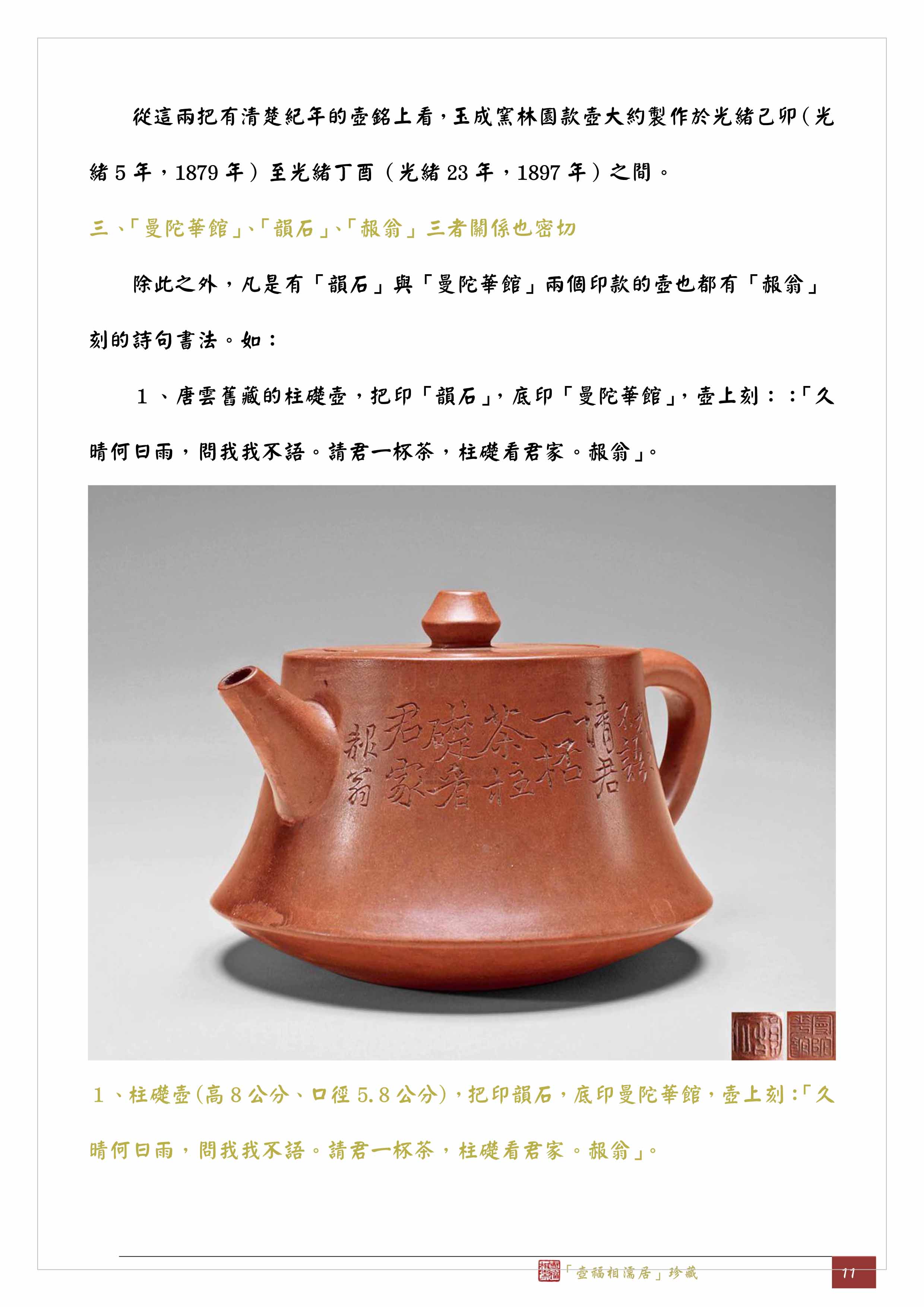 1、柱礎壺(高8公分、口徑5.8公分),把印韻石,底印曼陀華館,壺上刻:「久晴何日雨,問我我不語。請君一杯茶,柱礎看君家。赧翁」。