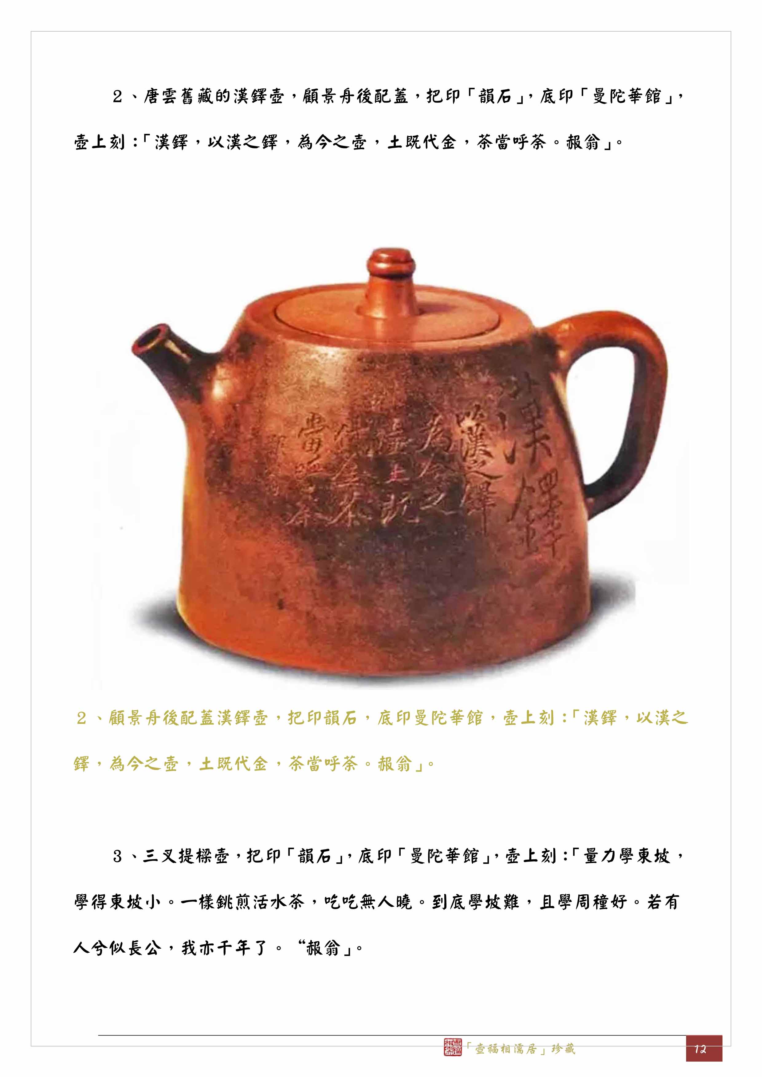 2、唐雲舊藏的漢鐸壺,顧景舟後配蓋,把印「韻石」,底印「曼陀華館」,壺上刻:「漢鐸,以漢之鐸,為今之壺,土既代金,茶當呼荼。赧翁」。