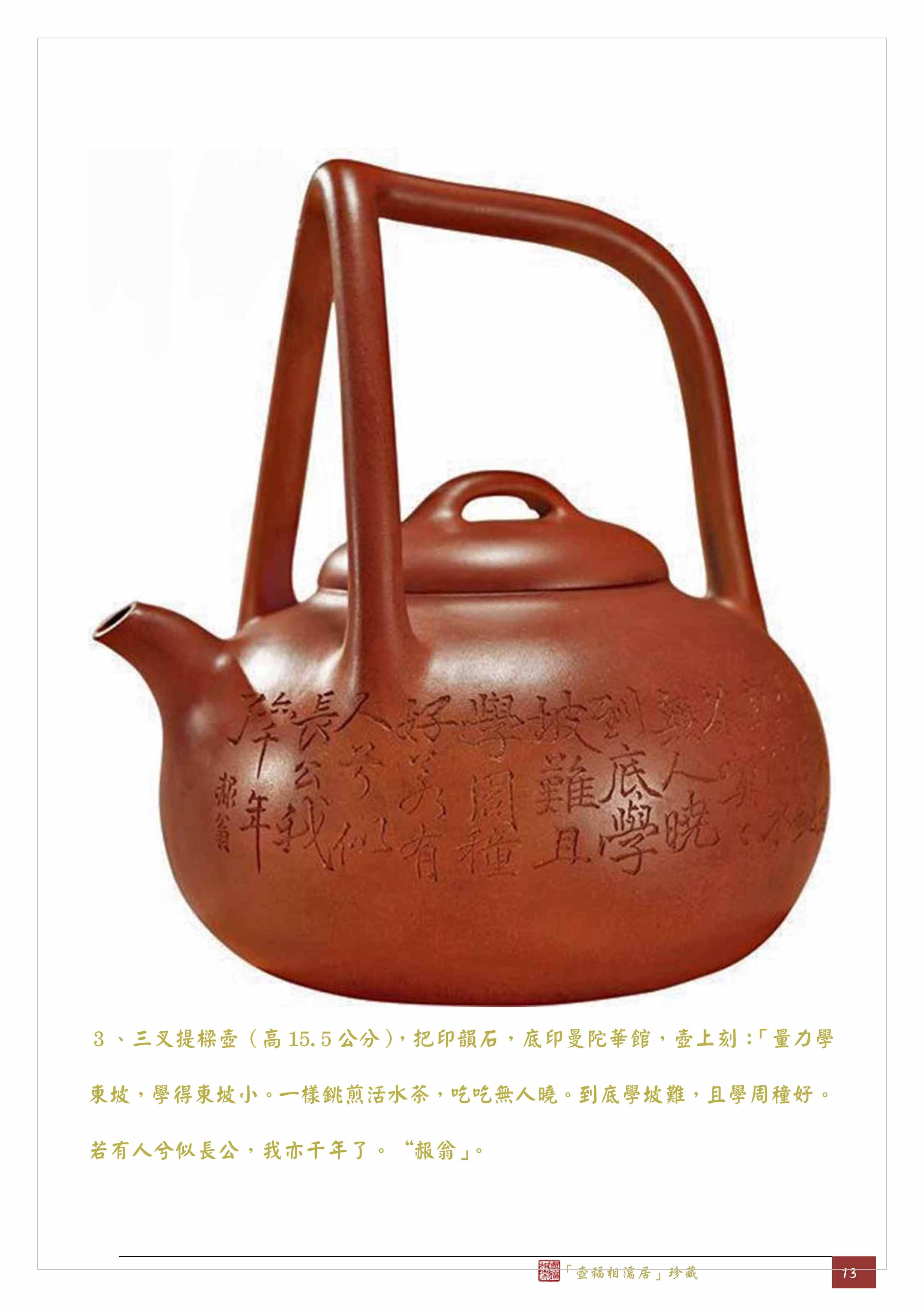 3、三叉提樑壺(高15.5公分),把印韻石,底印曼陀華館,壺上刻:「量力學東坡,學得東坡小。一樣銚煎活水茶,吃吃無人曉。到底學坡難,且學周穜好。若有人兮似長公,我亦千年了。“赧翁」。
