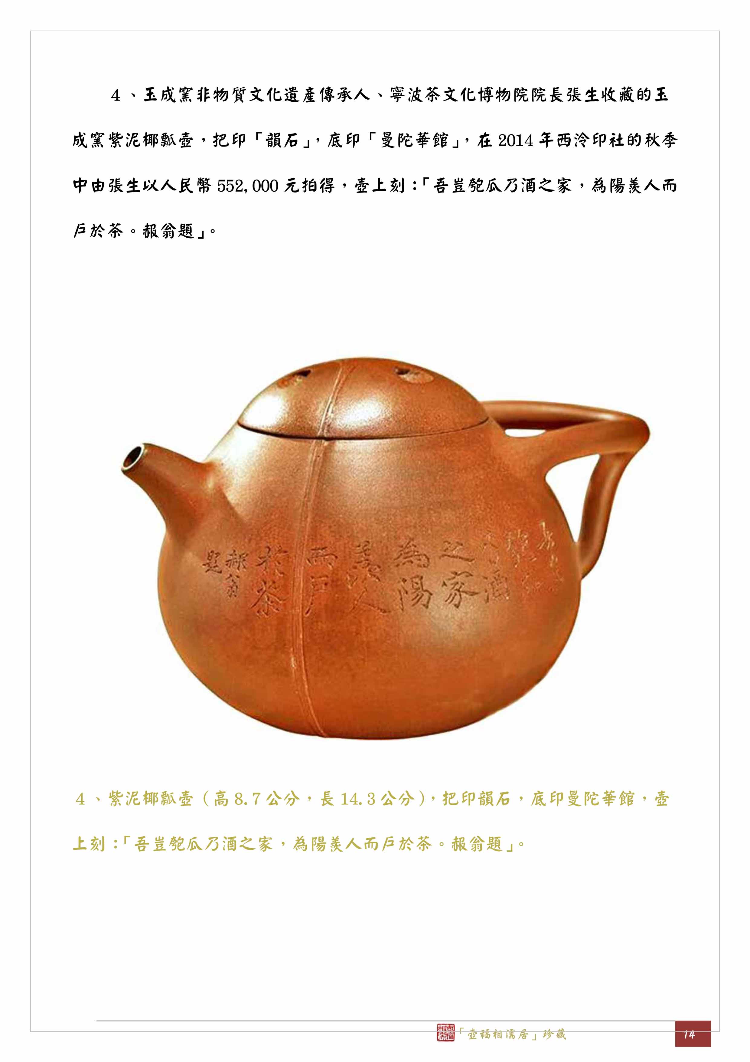 4、玉成窯非物質文化遺產傳承人、寧波茶文化博物院院長張生收藏的玉成窯紫泥椰瓢壺,把印「韻石」,底印「曼陀華館」,在2014年西泠印社的秋季中由張生以人民幣552,000元拍得,壺上刻:「吾豈匏瓜乃酒之家,為陽羨人而戶於茶。赧翁題」。