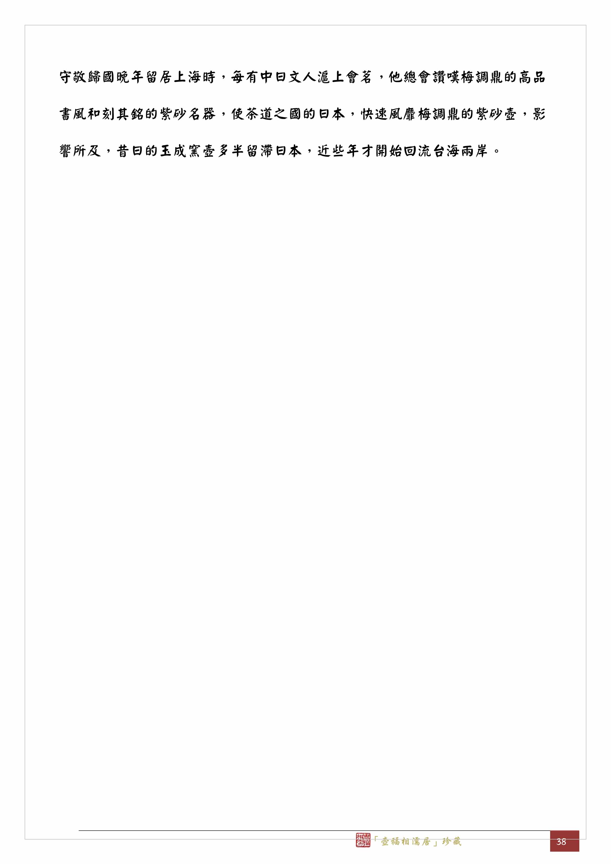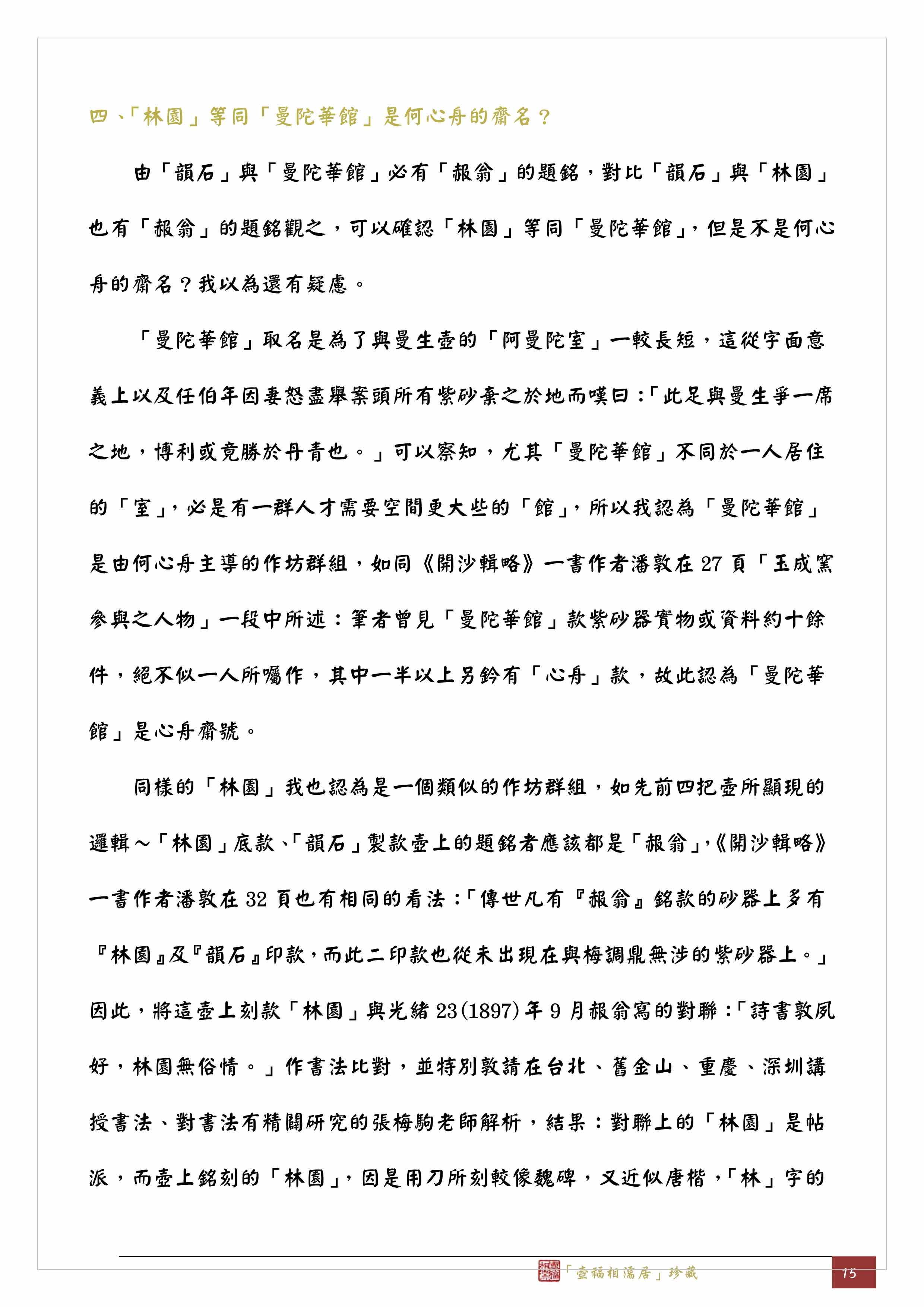 同樣的「林園」我也認為是一個類似的作坊群組,如先前四把壺所顯現的邏輯~「林園」底款、「韻石」製款壺上的題銘者應該都是「赧翁」,《開沙輯略》一書作者潘敦在32頁也有相同的看法:「傳世凡有『赧翁』銘款的砂器上多有『林園』及『韻石』印款,而此二印款也從未出現在與梅調鼎無涉的紫砂器上。」因此,將這壺上刻款「林園」與光緒23(1897)年9月赧翁寫的對聯:「詩書敦夙好,林園無俗情。」作書法比對,並特別敦請在台北、舊金山、重慶、深圳講授書法、對書法有精闢研究的張梅駒老師解析,結果:對聯上的「林園」是帖派,而壺上銘刻的「林園」,因是用刀所刻較像魏碑,又近似唐楷,「林」字的