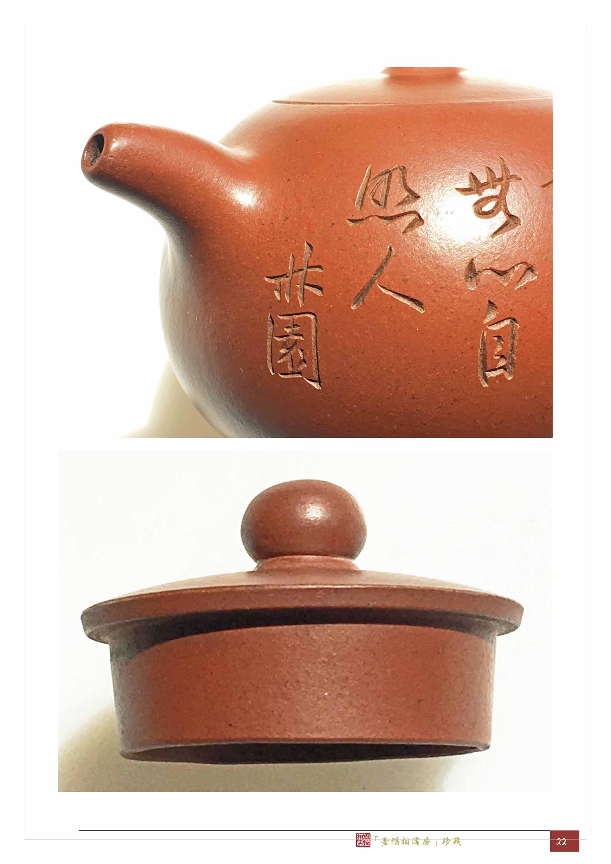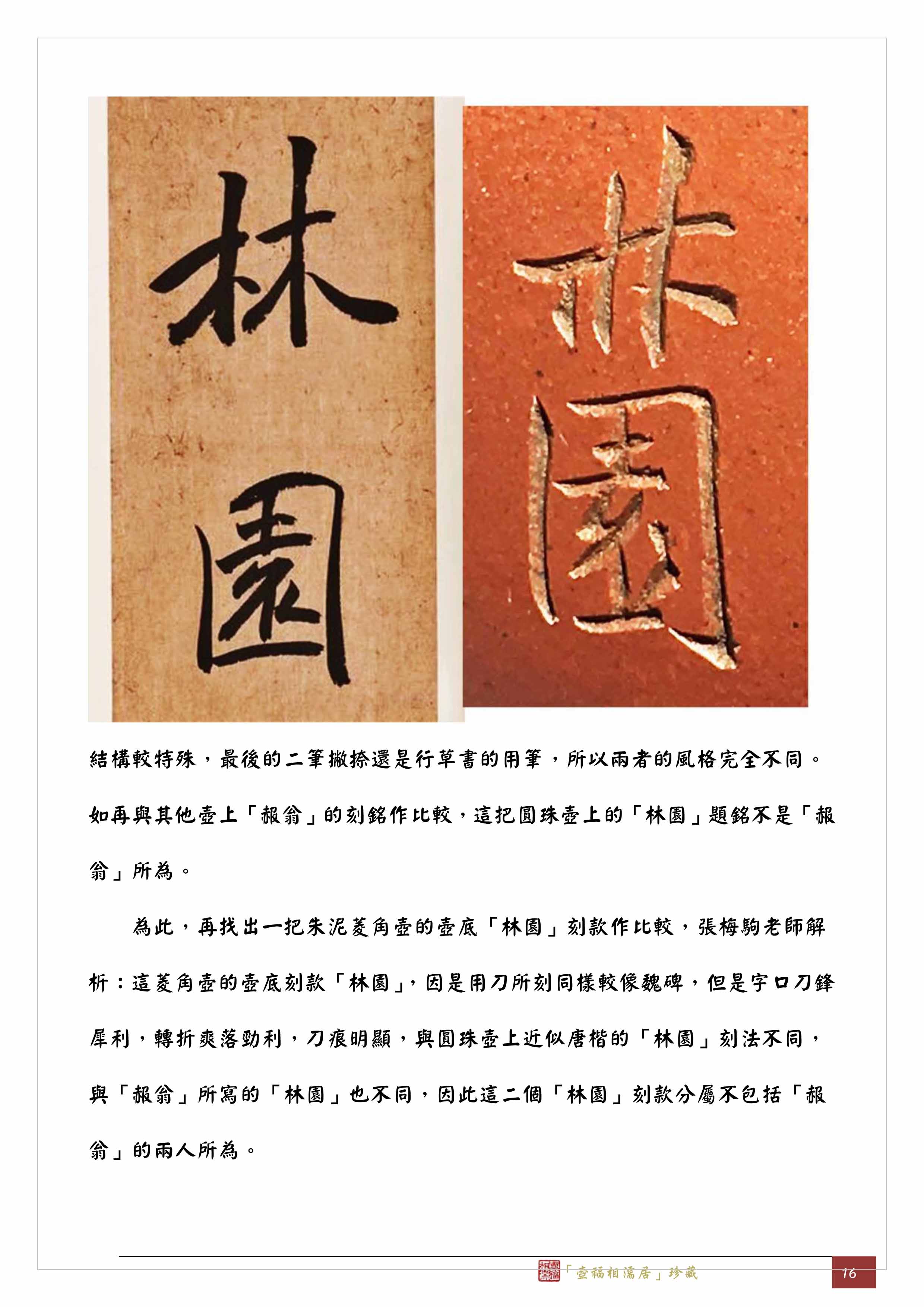 結構較特殊,最後的二筆撇捺還是行草書的用筆,所以兩者的風格完全不同。如再與其他壺上「赧翁」的刻銘作比較,這把圓珠壺上的「林園」題銘不是「赧翁」所為。