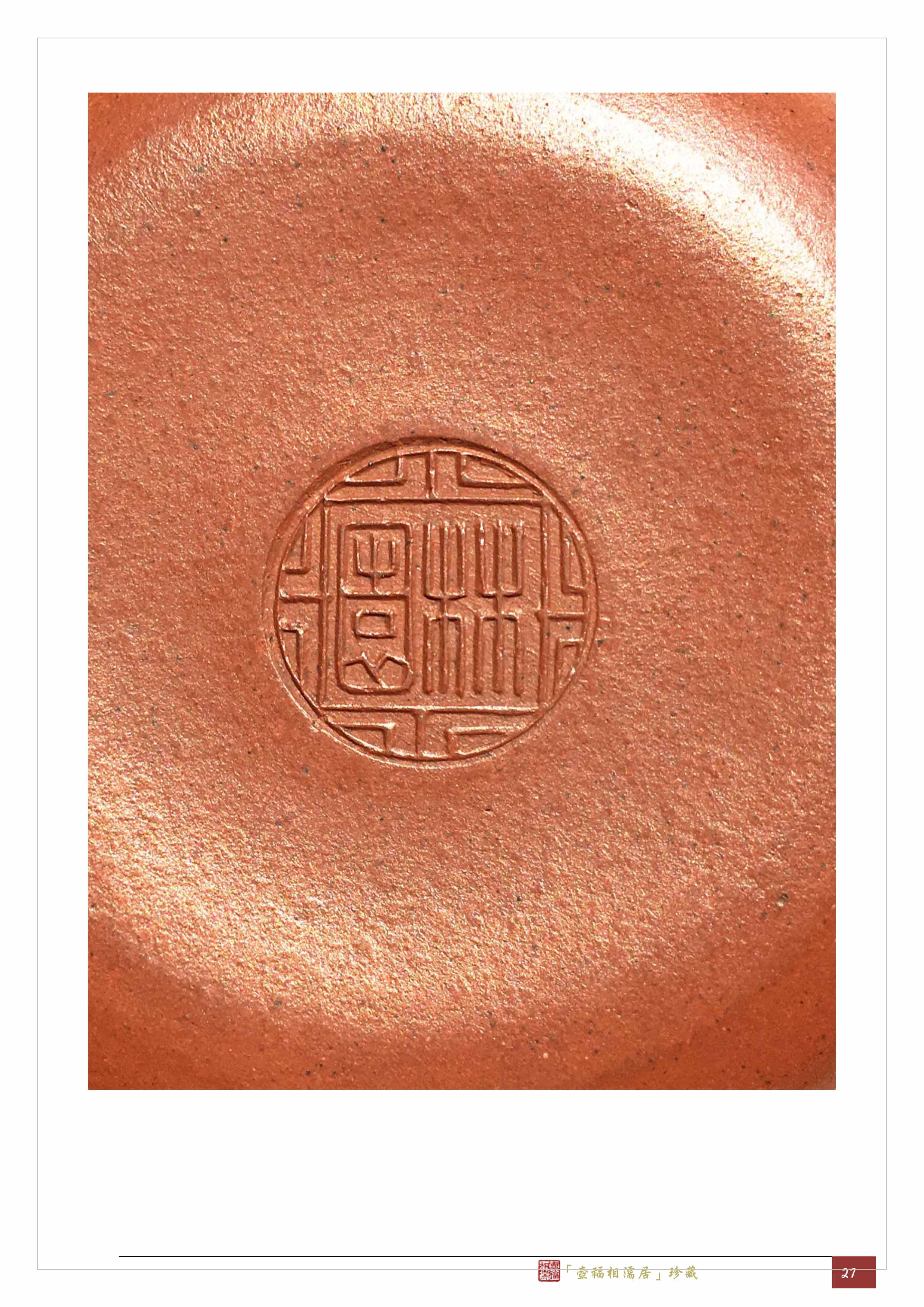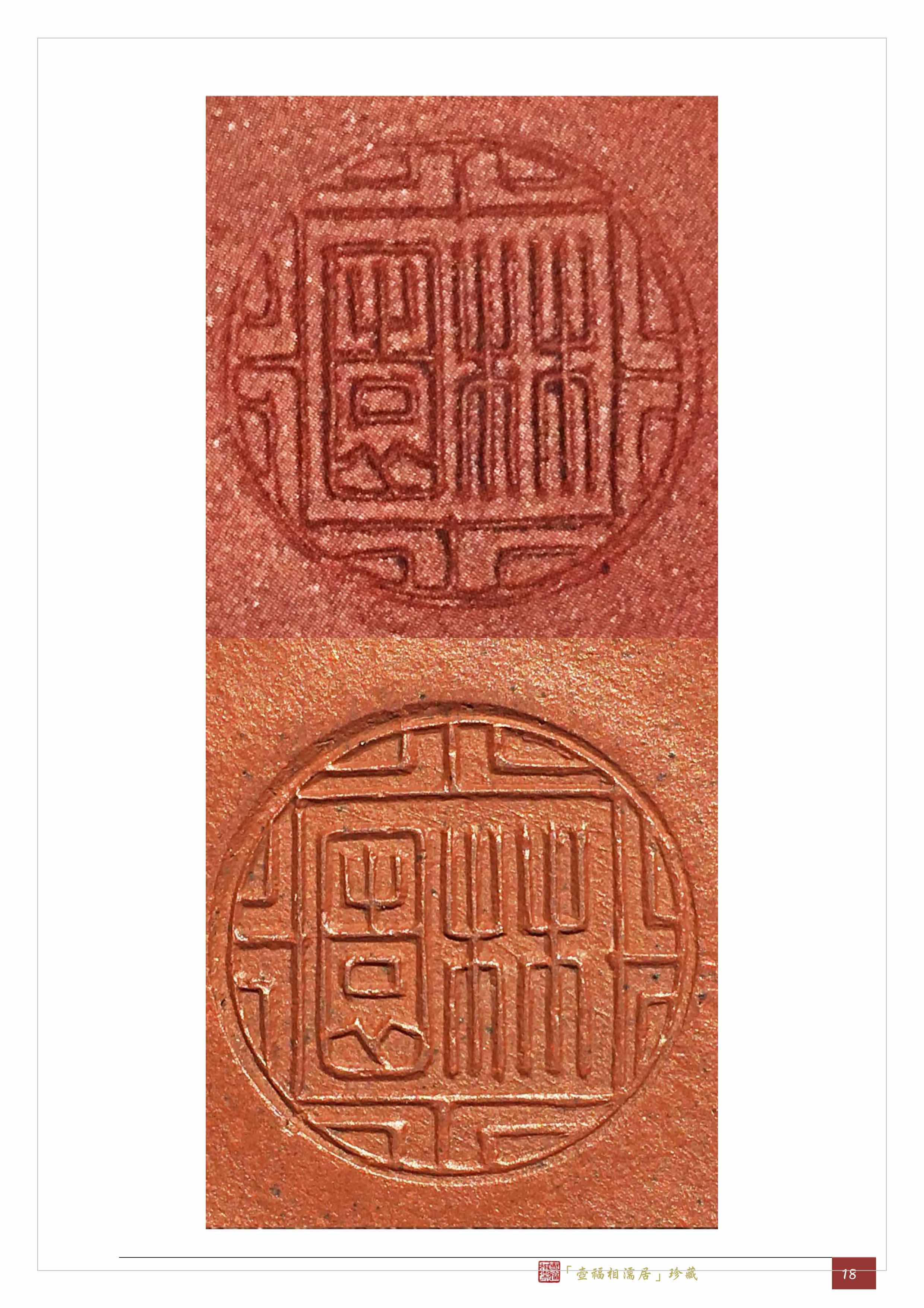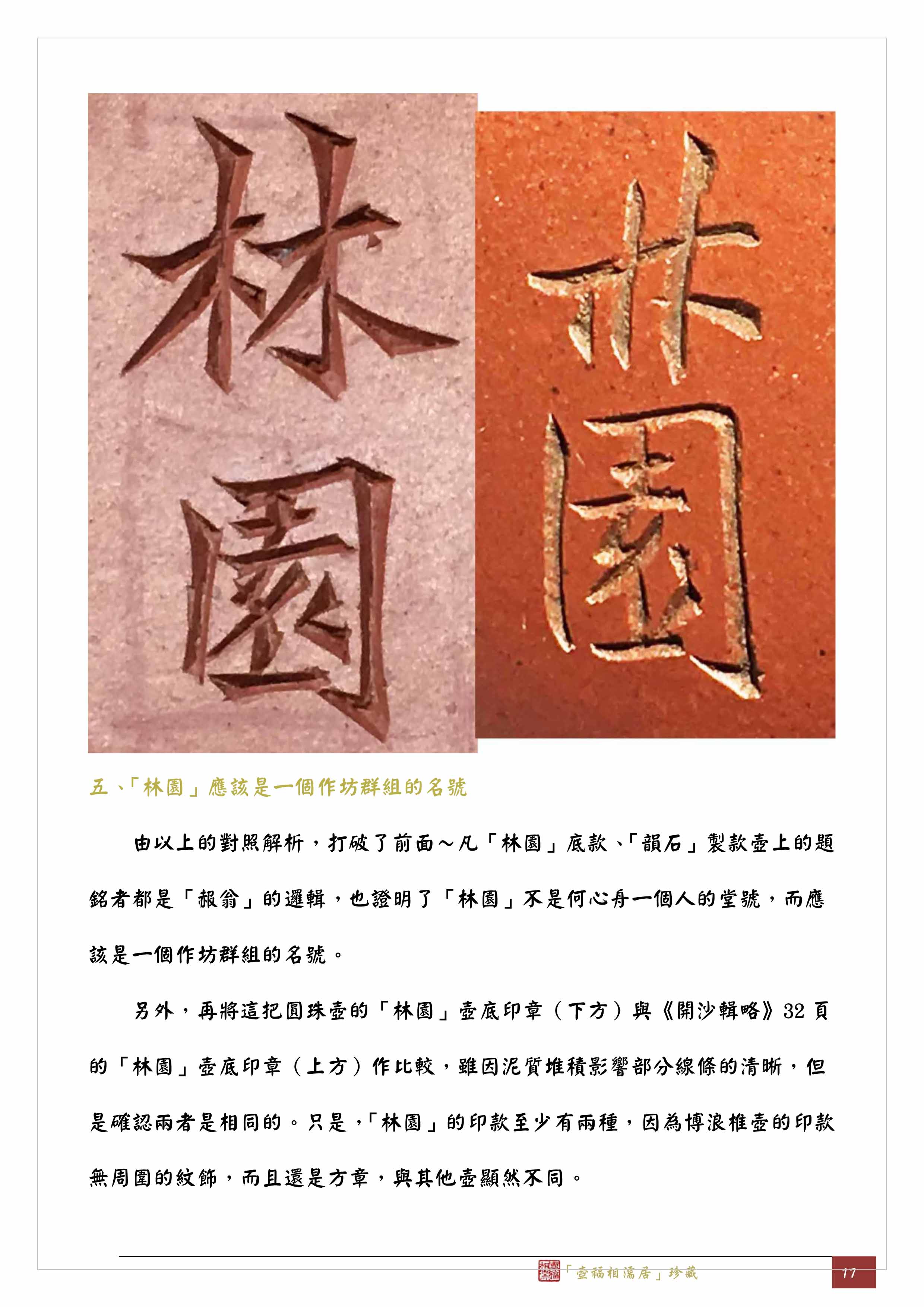 另外,再將這把圓珠壺的「林園」壺底印章(下方)與《開沙輯略》32頁的「林園」壺底印章(上方)作比較,雖因泥質堆積影響部分線條的清晰,但是確認兩者是相同的。只是,「林園」的印款至少有兩種,因為博浪椎壺的印款無周圍的紋飾,而且還是方章,與其他壺顯然不同。