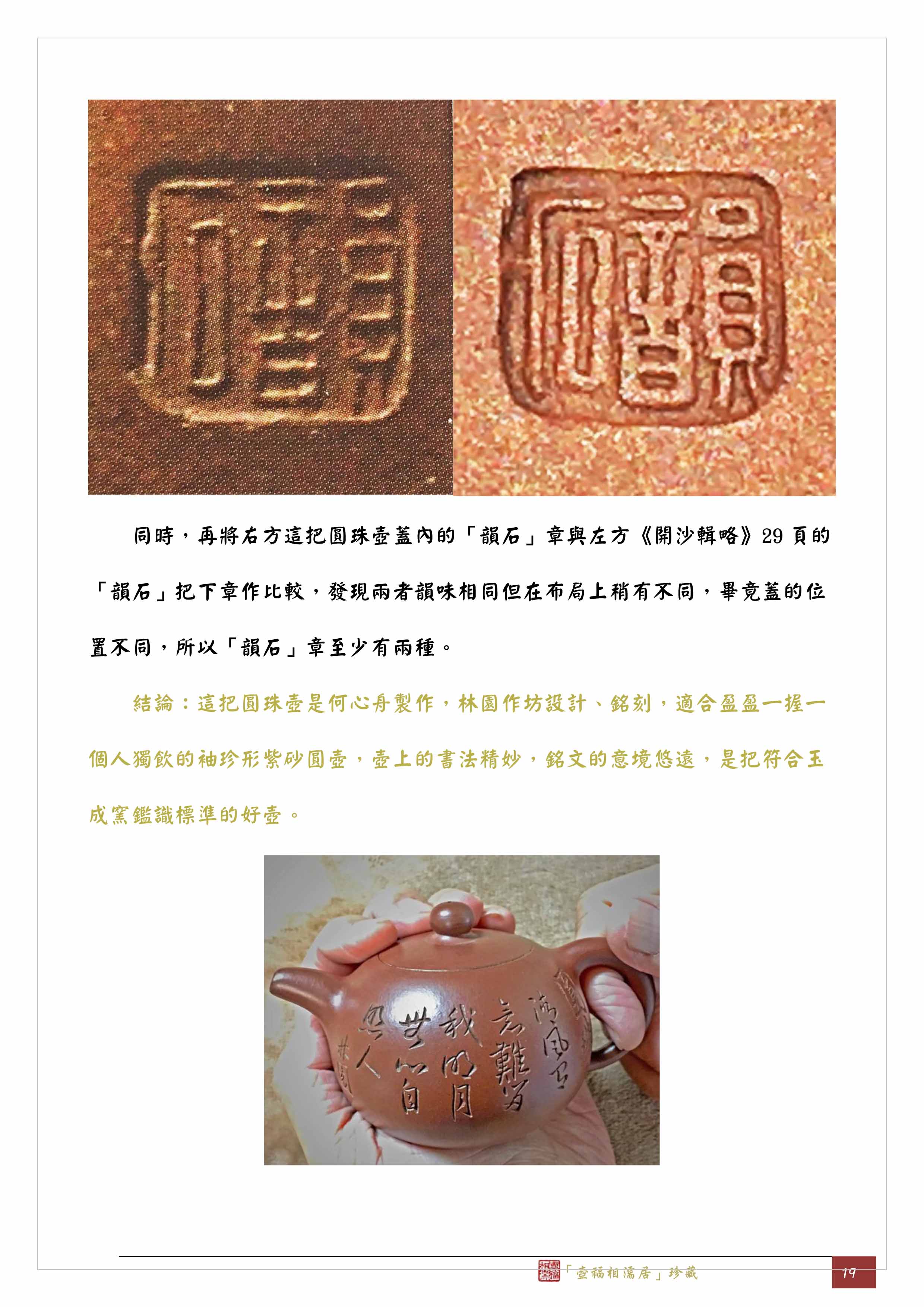 同時,再將右方這把圓珠壺蓋內的「韻石」章與左方《開沙輯略》29頁的「韻石」把下章作比較,發現兩者韻味相同但在布局上稍有不同,畢竟蓋的位置不同,所以「韻石」章至少有兩種。