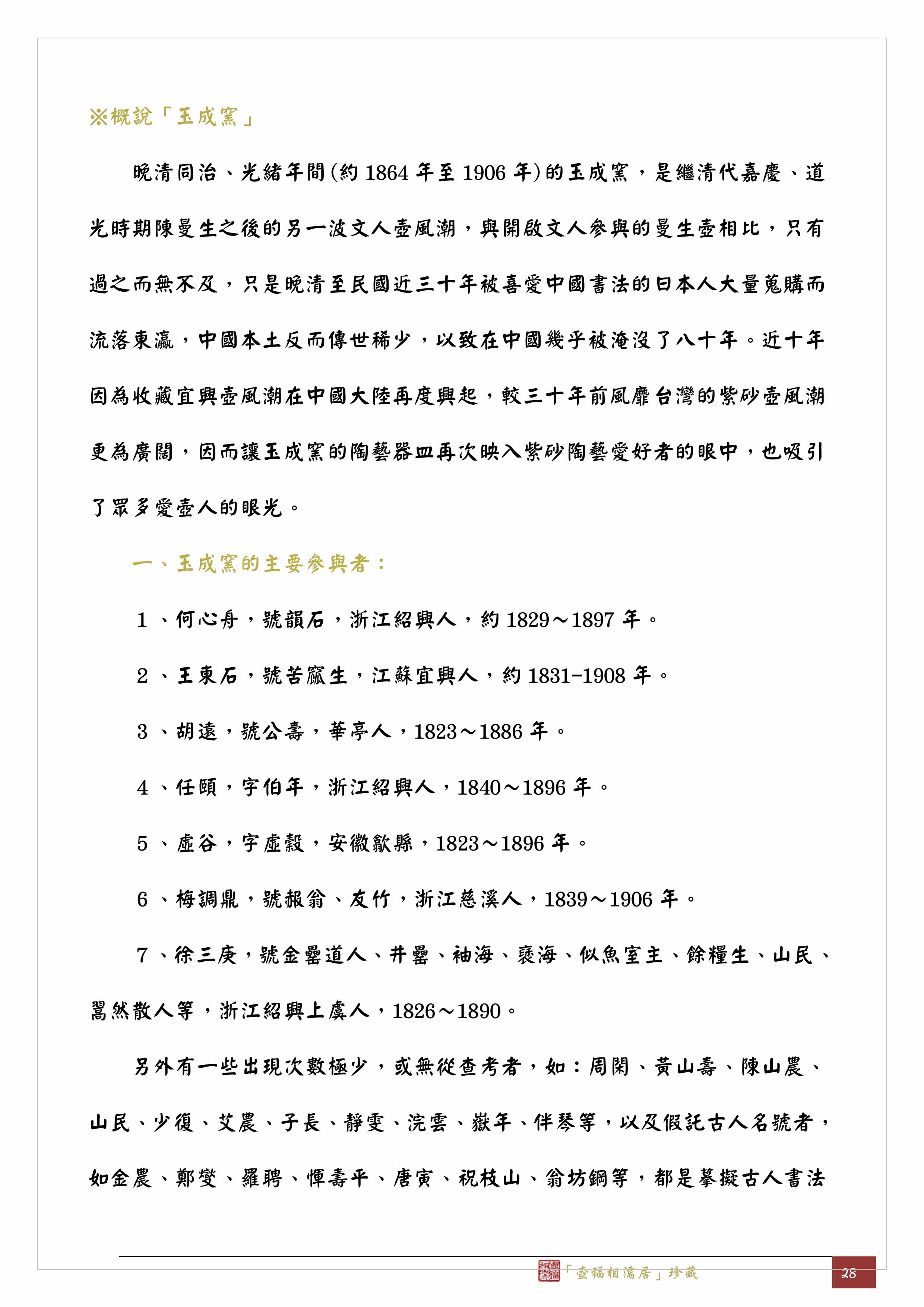 從這兩把有清楚紀年的壺銘上看,玉成窯林園款壺大約製作於光緒己卯(光緒5年,1879年)至光緒丁酉(光緒23年,1897年)之間。