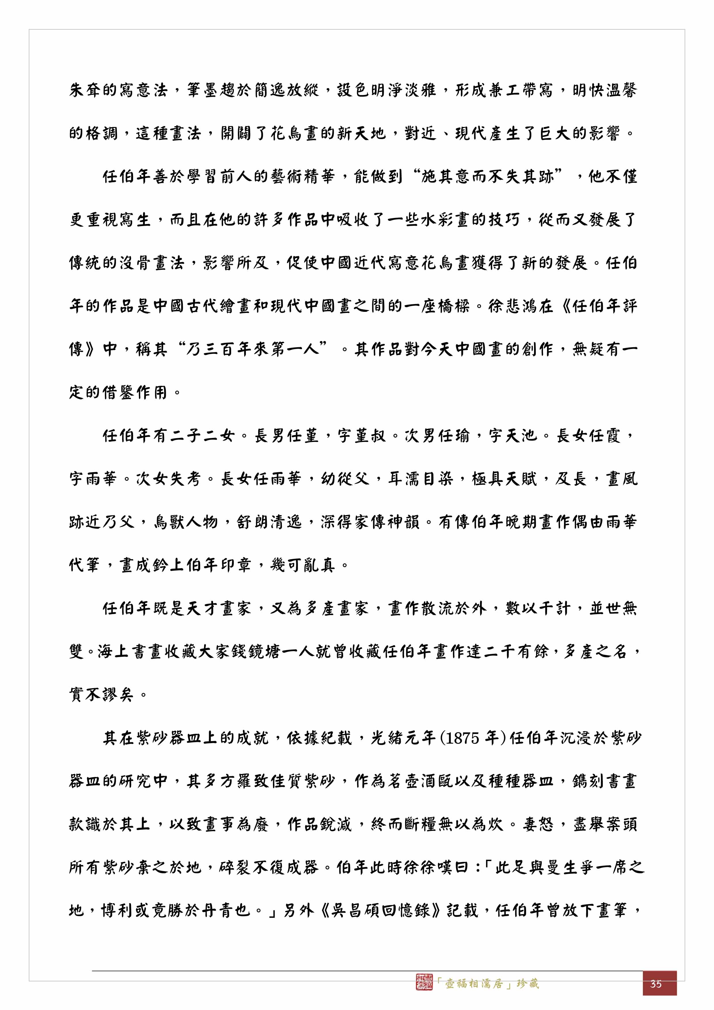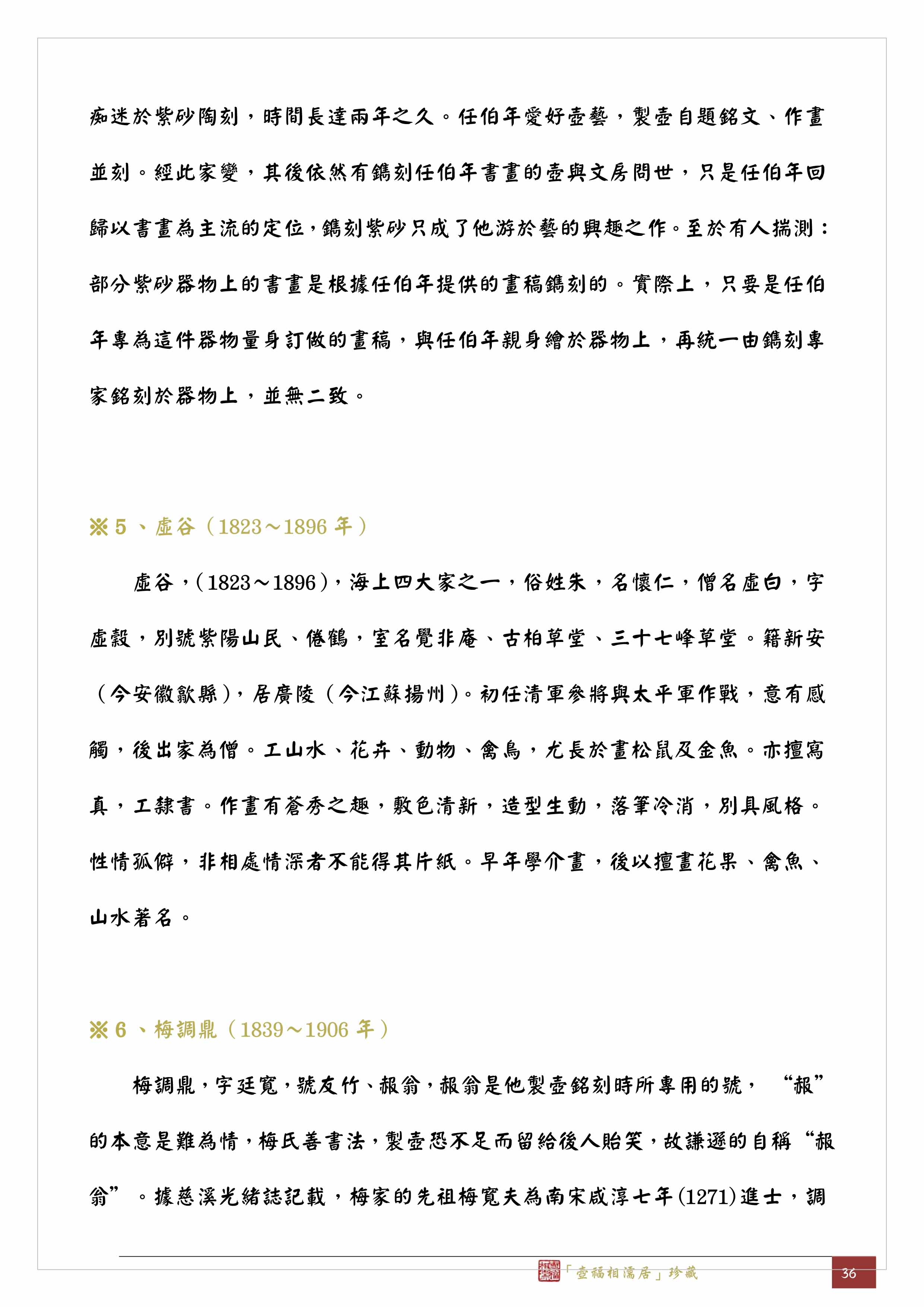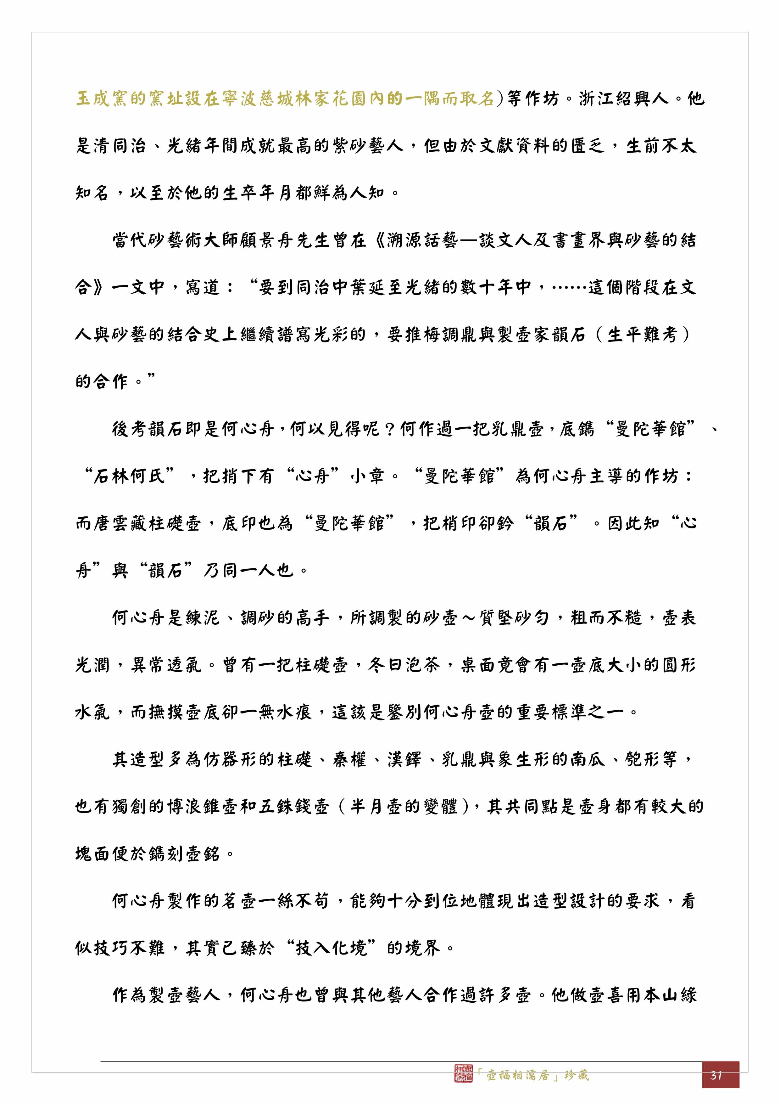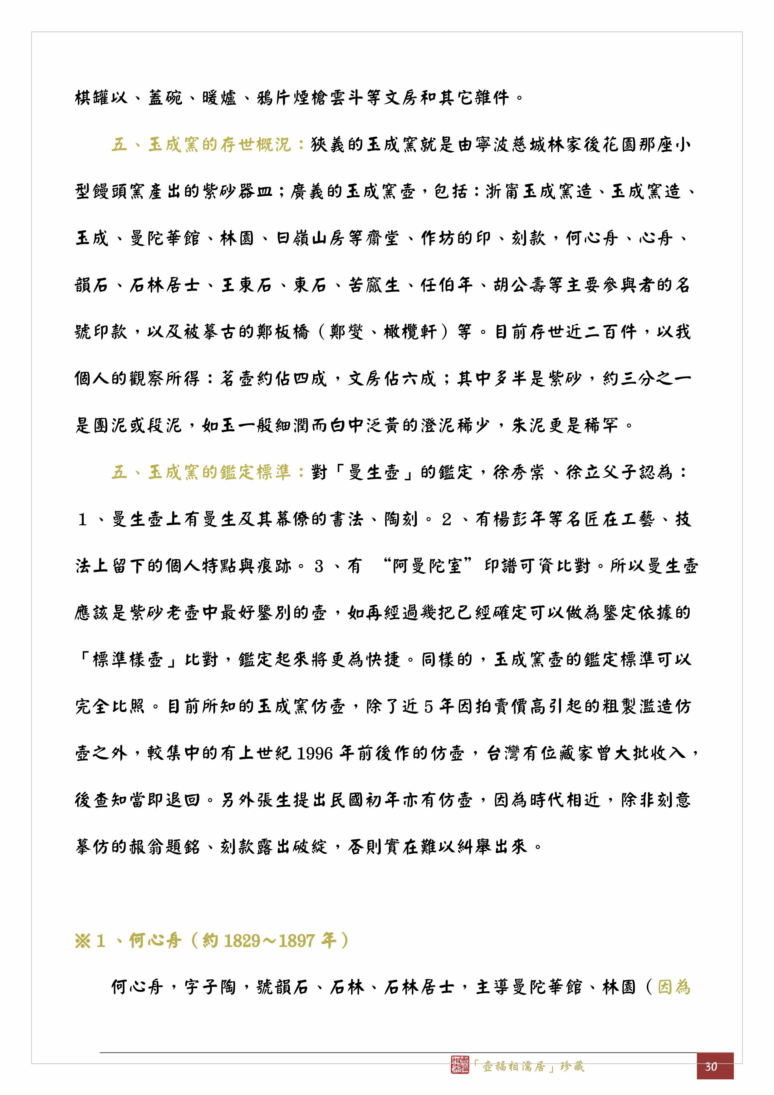 「曼陀華館」取名是為了與曼生壺的「阿曼陀室」一較長短,這從字面意義上以及任伯年因妻怒盡舉案頭所有紫砂棄之於地而嘆曰:「此足與曼生爭一席之地,博利或竟勝於丹青也。」可以察知,尤其「曼陀華館」不同於一人居住的「室」,必是有一群人才需要空間更大些的「館」,所以我認為「曼陀華館」是由何心舟主導的作坊群組,如同《開沙輯略》一書作者潘敦在27頁「玉成窯參與之人物」一段中所述:筆者曾見「曼陀華館」款紫砂器實物或資料約十餘件,絕不似一人所囑作,其中一半以上另鈐有「心舟」款,故此認為「曼陀華館」是心舟齋號。