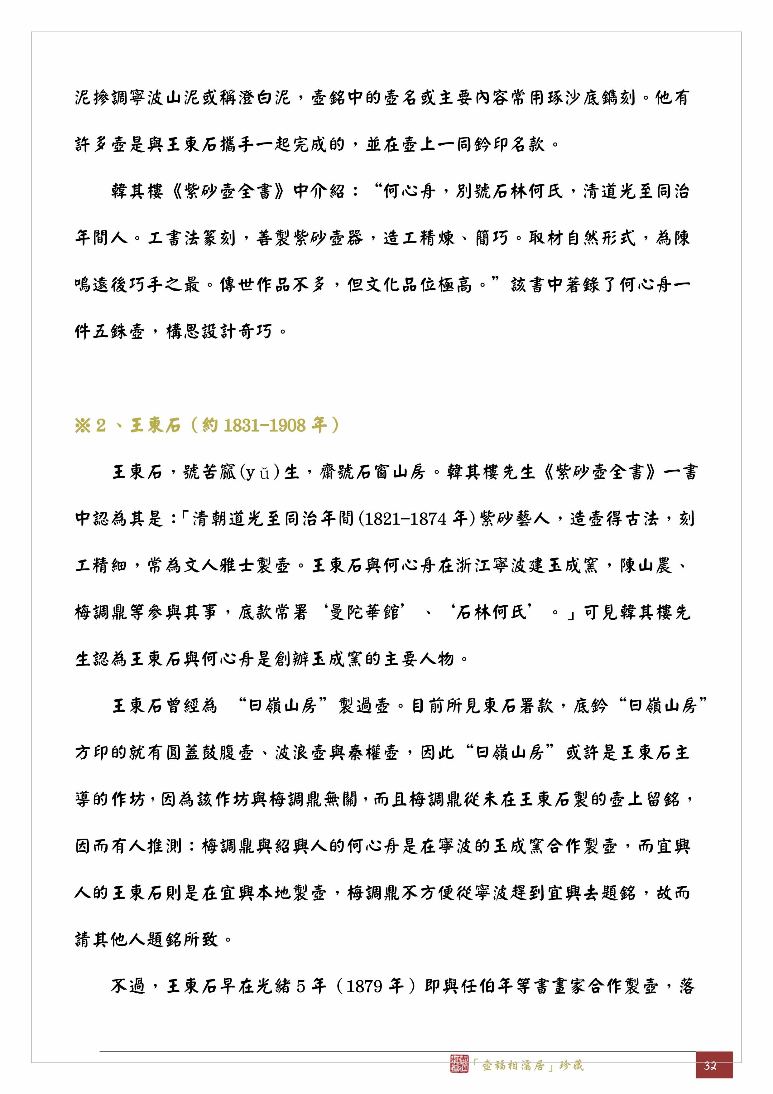 由以上的對照解析,打破了前面~凡「林園」底款、「韻石」製款壺上的題銘者都是「赧翁」的邏輯,也證明了「林園」不是何心舟一個人的堂號,而應該是一個作坊群組的名號。