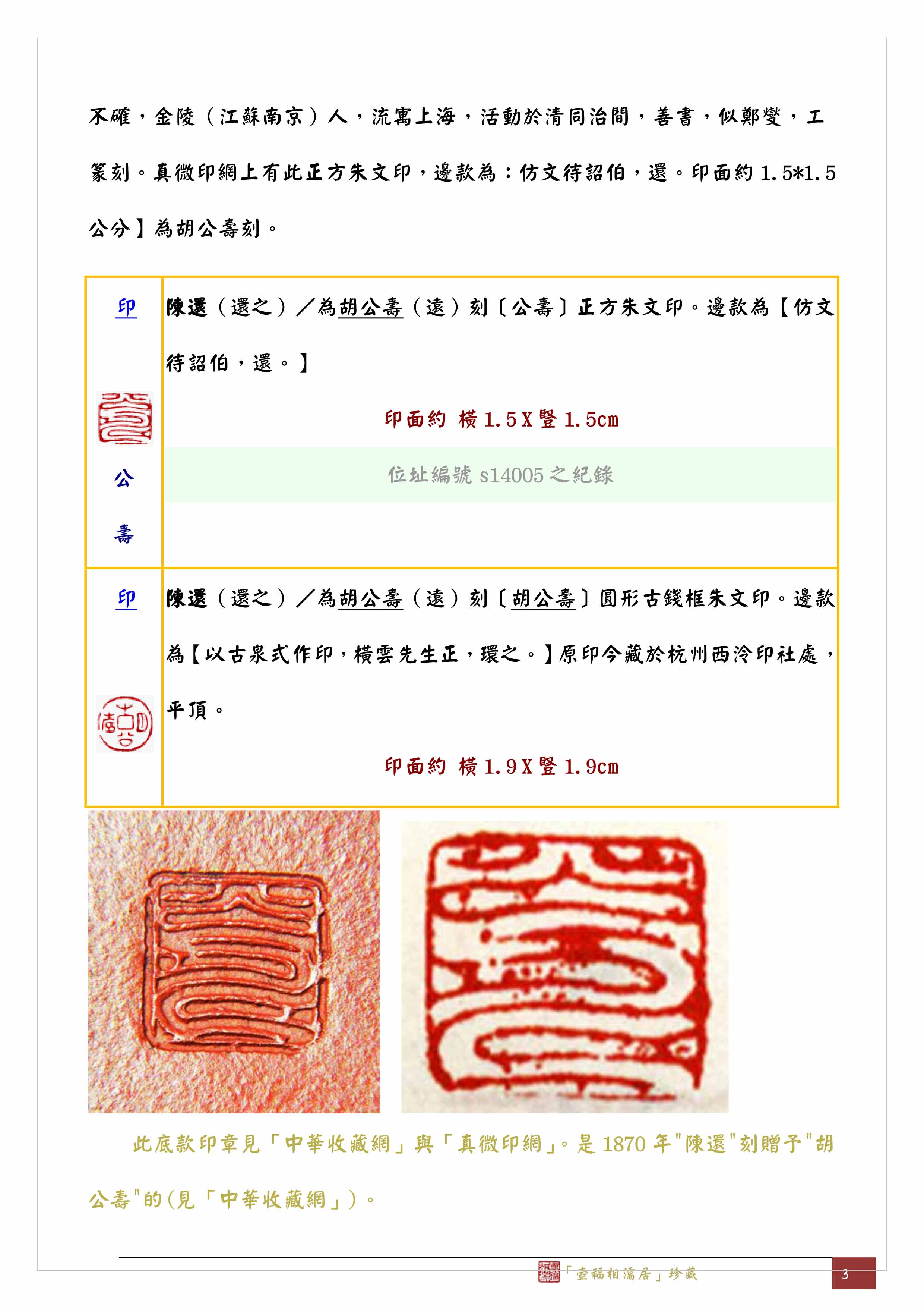 此底款印章見「中華收藏網」與「真微印網」。是1870年"陳還"刻贈予"胡公壽"的(見「中華收藏網」)。