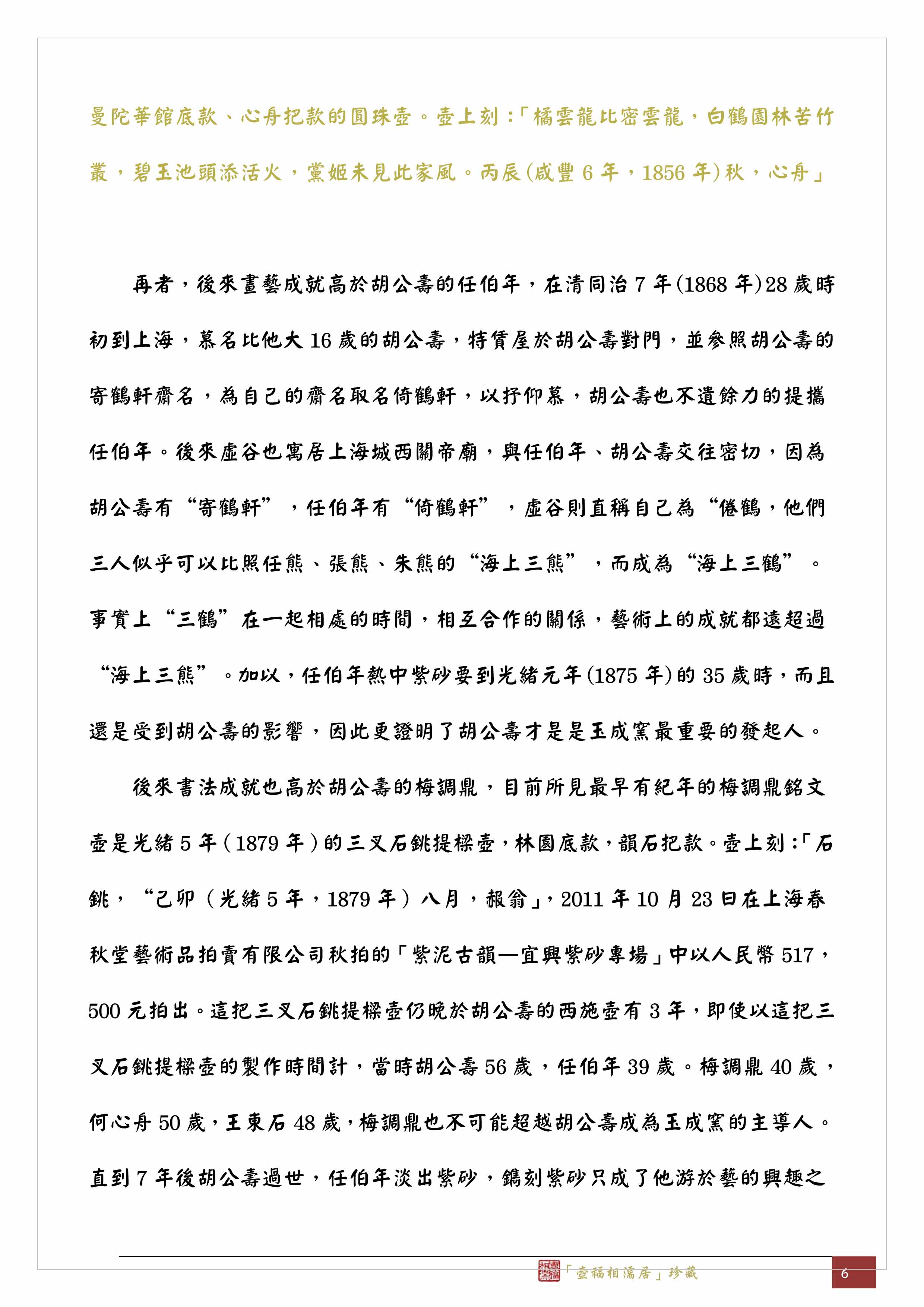 再者,後來畫藝成就高於胡公壽的任伯年,在清同治7年(1868年)28歲時初到上海,慕名比他大16歲的胡公壽,特賃屋於胡公壽對門,並參照胡公壽的寄鶴軒齋名,為自己的齋名取名倚鶴軒,以抒仰慕,胡公壽也不遺餘力的提攜任伯年。後來虛谷也寓居上海城西關帝廟,與任伯年、胡公壽交往密切,因為胡公壽有“寄鶴軒”,任伯年有“倚鶴軒”,虛谷則直稱自己為“倦鶴,他們三人似乎可以比照任熊、張熊、朱熊的“海上三熊”,而成為“海上三鶴”。事實上“三鶴”在一起相處的時間,相互合作的關係,藝術上的成就都遠超過“海上三熊”。加以,任伯年熱中紫砂要到光緒元年(1875年)的35歲時,而且還是受到胡公壽的影響,因此更證明了胡公壽才是是玉成窯最重要的發起人。