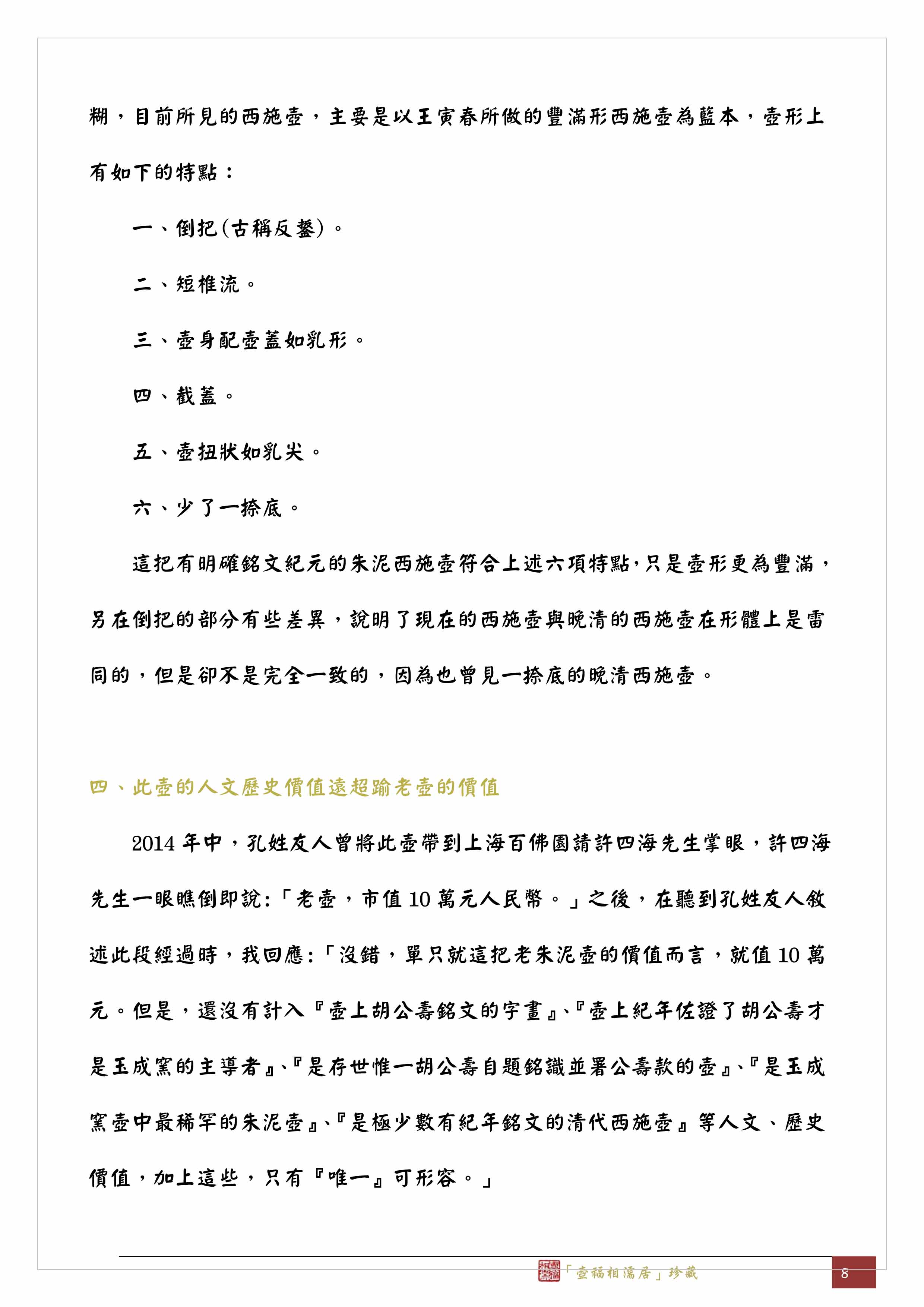2014年中,孔姓友人曾將此壺帶到上海百佛園請許四海先生掌眼,許四海先生一眼瞧倒即說:「老壺,市值10萬元人民幣。」之後,在聽到孔姓友人敘述此段經過時,我回應:「沒錯,單只就這把老朱泥壺的價值而言,就值10萬元。但是,還沒有計入『壺上胡公壽銘文的字畫』、『壺上紀年佐證了胡公壽才是玉成窯的主導者』、『是存世惟一胡公壽自題銘識並署公壽款的壺』、『是玉成窯壺中最稀罕的朱泥壺』、『是極少數有紀年銘文的清代西施壺』等人文、歷史價值,加上這些,只有『唯一』可形容。」
