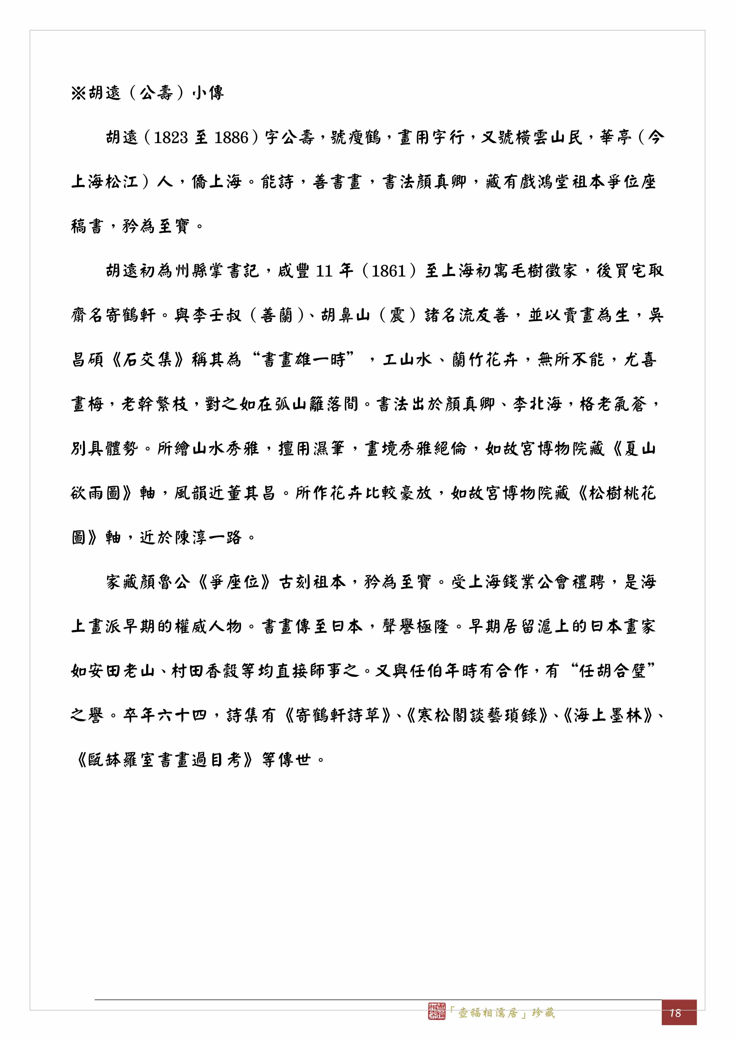 胡遠(1823至1886)字公壽,號瘦鶴,畫用字行,又號橫雲山民,華亭(今上海松江)人,僑上海。能詩,善書畫,書顏真卿,藏有戲鴻堂祖本爭位座稿書,矜為至寶。