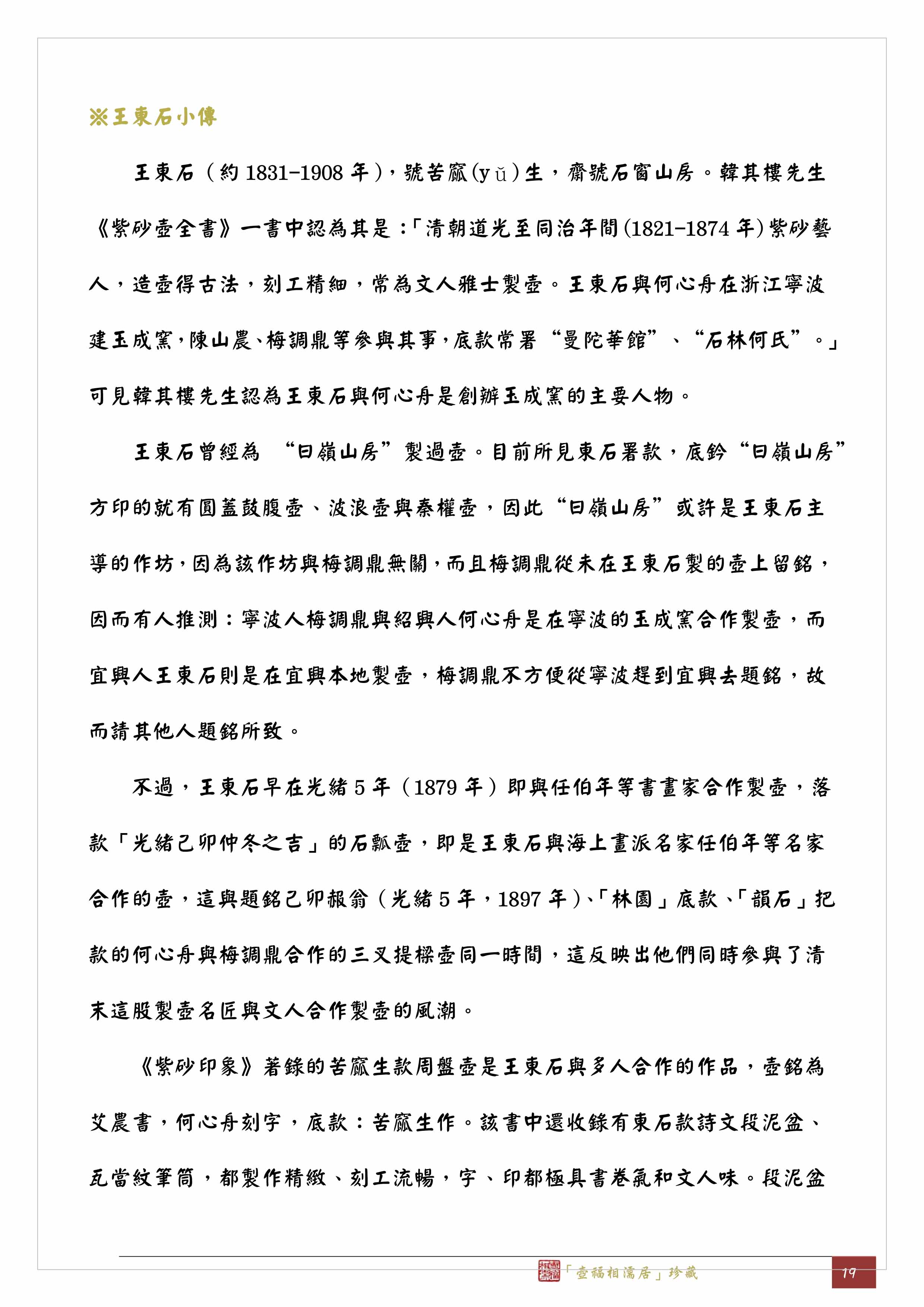 不過,王東石早在光緒5年(1879年)即與任伯年等書畫家合作製壺,落款「光緒己卯仲冬之吉」的石瓢壺,即是王東石與海上畫派名家任伯年等名家合作的壺,這與題銘己卯赧翁(光緒5年,1897年)、「林園」底款、「韻石」把款的何心舟與梅調鼎合作的三叉提樑壺同一時間,這反映出他們同時參與了清末這股製壺名匠與文人合作製壺的風潮。