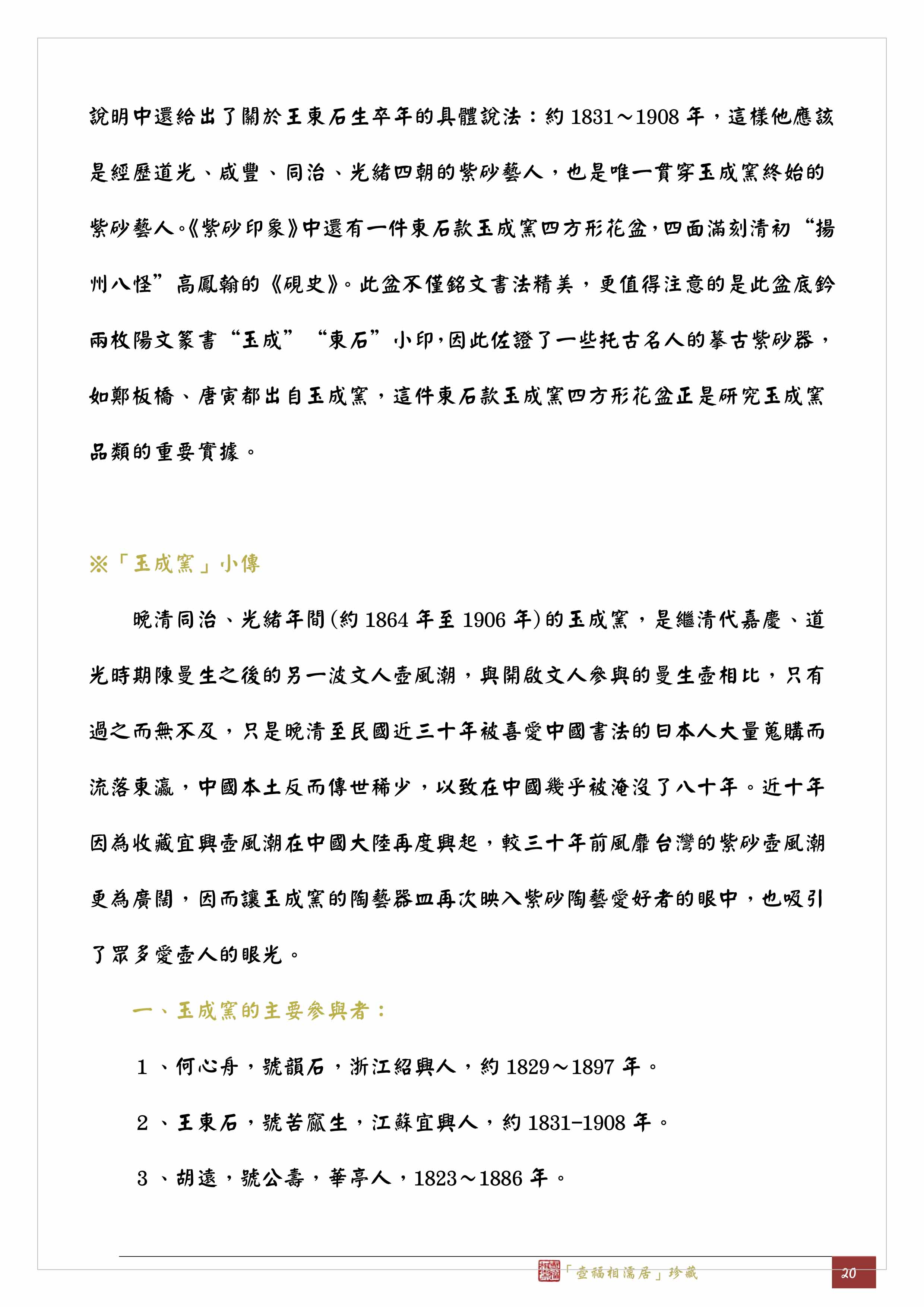 五、玉成窯的存世概況:狹義的玉成窯就是由寧波慈城林家後花園那座小型饅頭窯產出的紫砂器皿;廣義的玉成窯壺,包括:浙甯玉成窯造、玉成窯造、玉成、曼陀華館、林園、日嶺山房等齋堂、作坊的印、刻款,何心舟、心舟、韻石、石林居士、王東石、東石、苦窳生、任伯年、胡公壽等主要參與者的名號印款,以及被摹古的鄭板橋(鄭燮、橄欖軒)等。目前存世近二百件,以我個人的觀察所得:茗壺約佔四成,文房佔六成;其中多半是紫砂,約三分之一是團泥或段泥,如玉一般細潤而白中泛黃的澄泥稀少,朱泥更是稀罕。