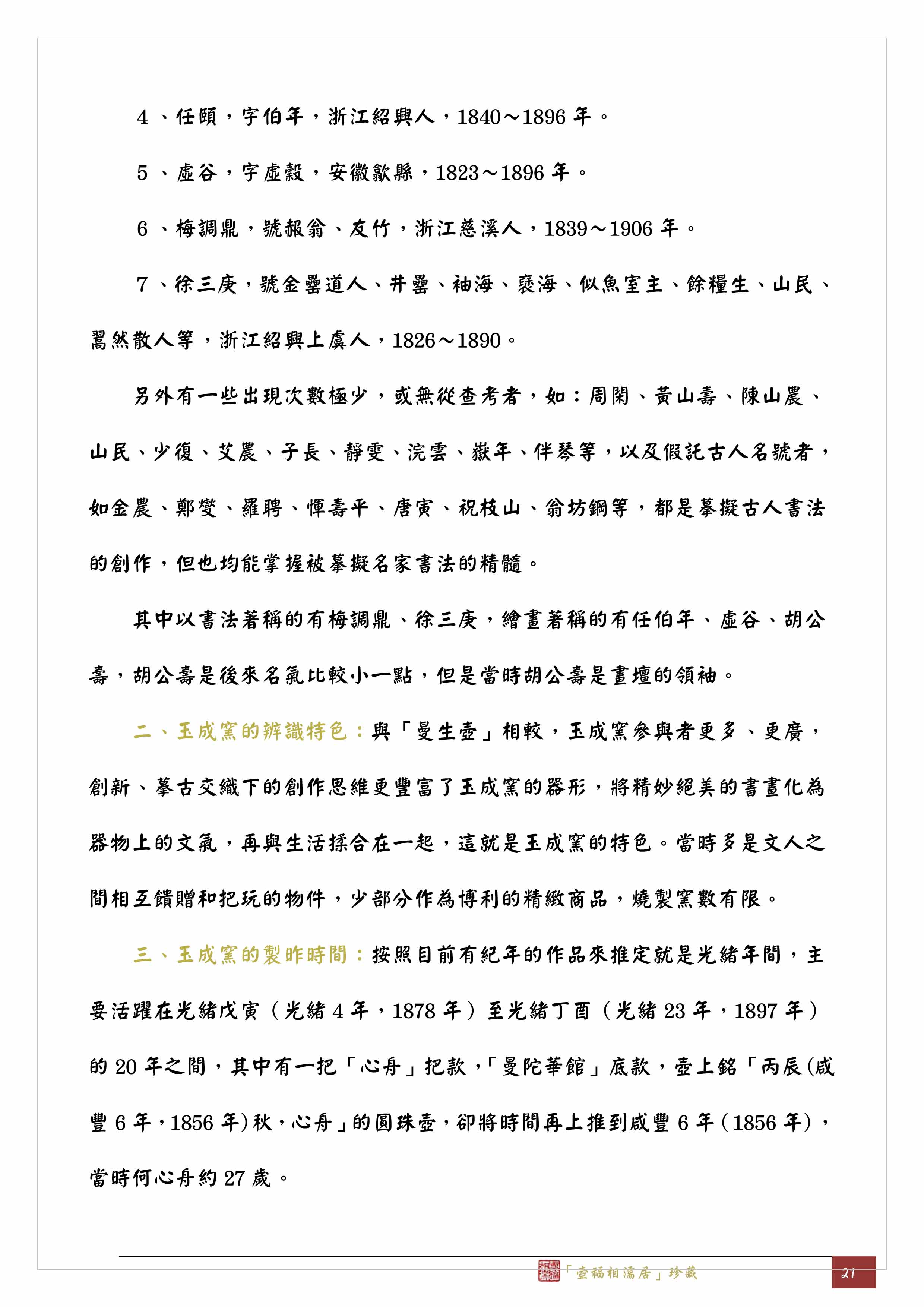 三、玉成窯的製昨時間:按照目前有紀年的作品來推定就是光緒年間,主要活躍在光緒戊寅(光緒4年,1878年)至光緒丁酉(光緒23年,1897年)的20年之間,其中有一把「心舟」把款,「曼陀華館」底款,壺上銘「丙辰(咸豐6年,1856年)秋,心舟」的圓珠壺,卻將時間再上推到咸豐6年(1856年),當時何心舟約27歲。