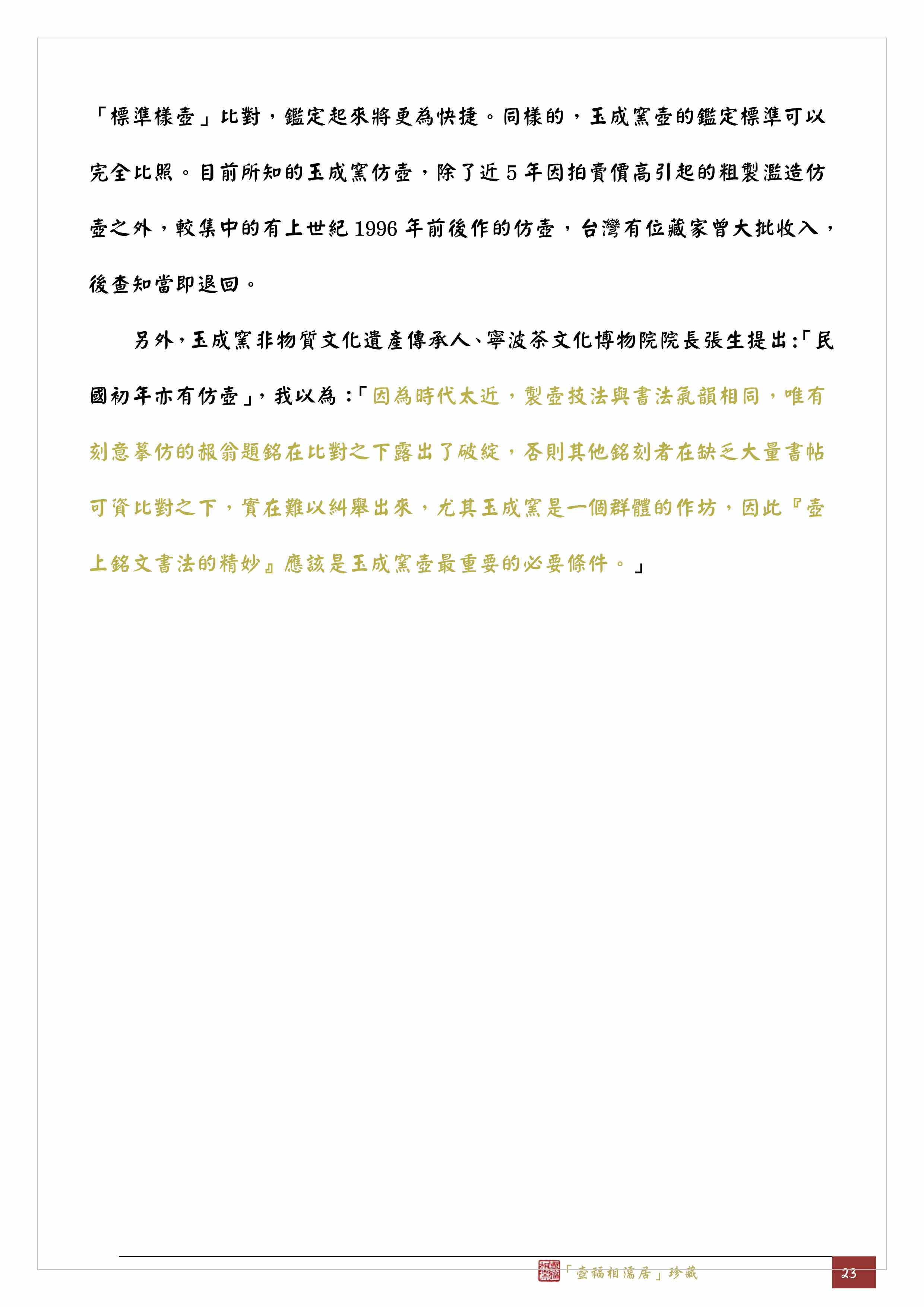另外,玉成窯非物質文化遺產傳承人、寧波茶文化博物院院長張生提出:「民國初年亦有仿壺」,我以為:「因為時代太近,製壺技法與書法氣韻相同,唯有刻意摹仿的赧翁題銘在比對之下露出了破綻,否則其他銘刻者在缺乏大量書帖可資比對之下,實在難以糾舉出來,尤其玉成窯是一個群體的作坊,因此『壺上銘文書法的精妙』應該是玉成窯壺最重要的必要條件。」