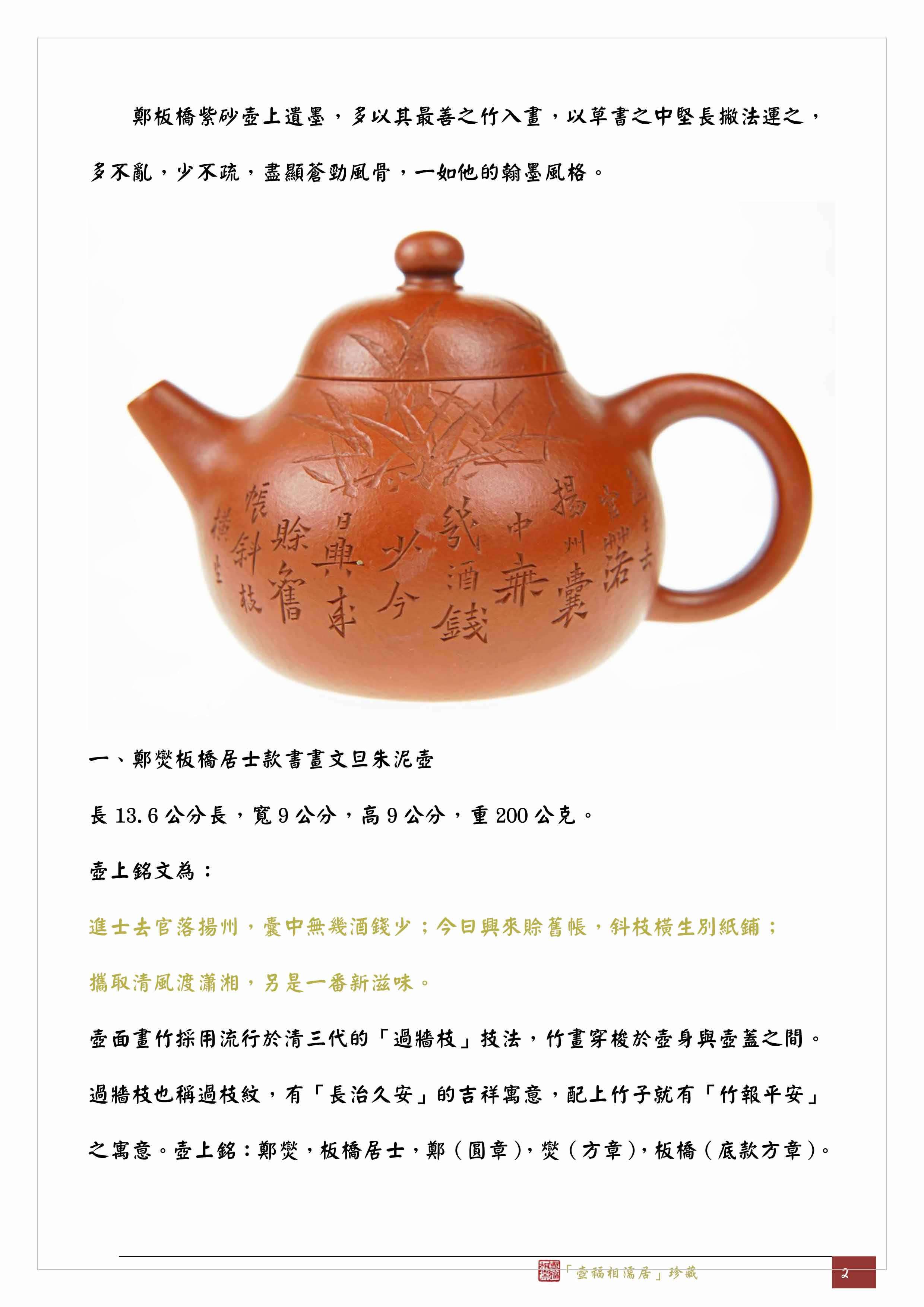 壺面畫竹採用流行於清三代的「過牆枝」技法,竹畫穿梭於壺身與壺蓋之間。過牆枝也稱過枝紋,有「長治久安」的吉祥寓意,配上竹子就有「竹報平安」之寓意。壺上銘:板橋居士,鄭(圓章),爕(方章),板橋(底款方章)。