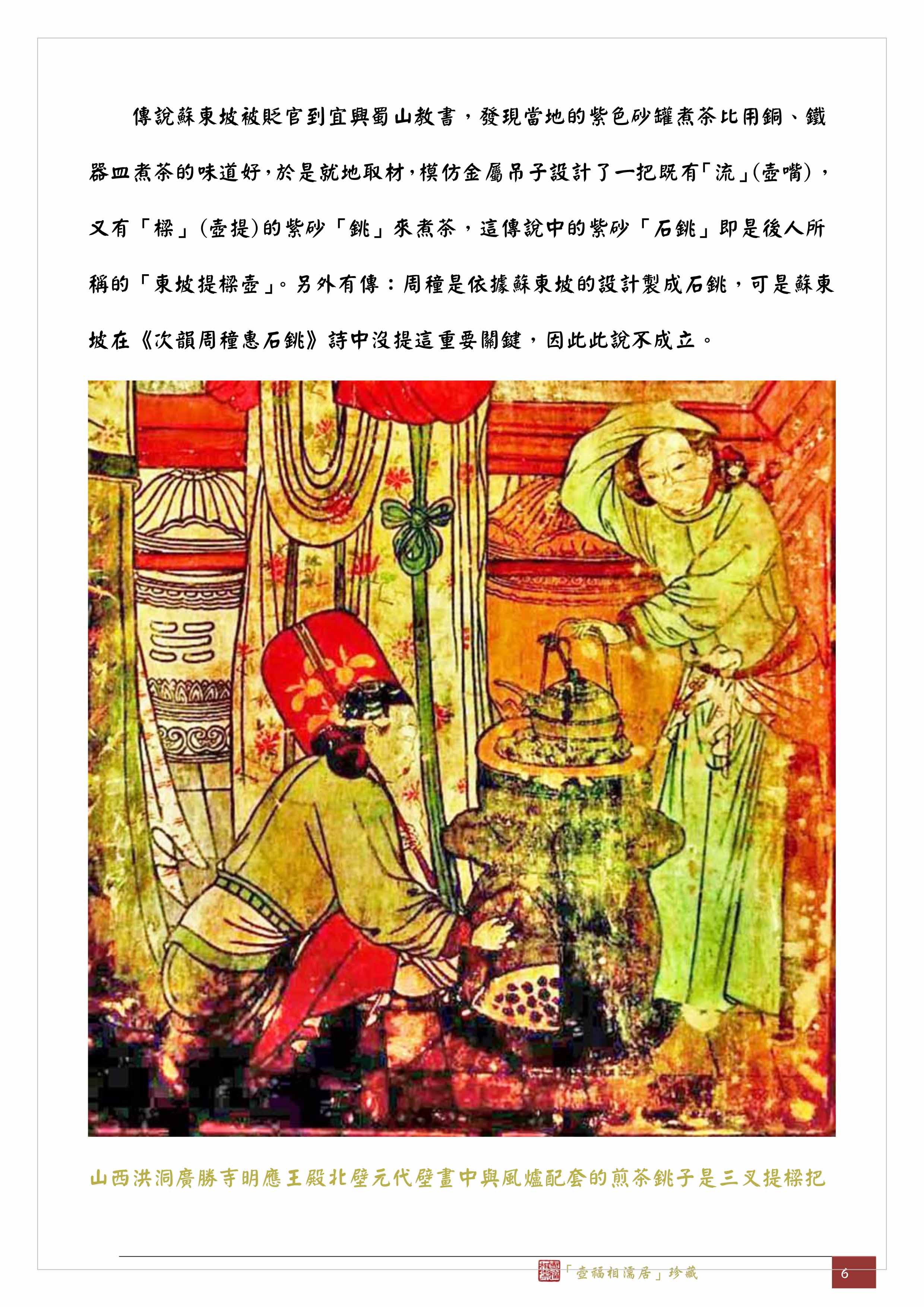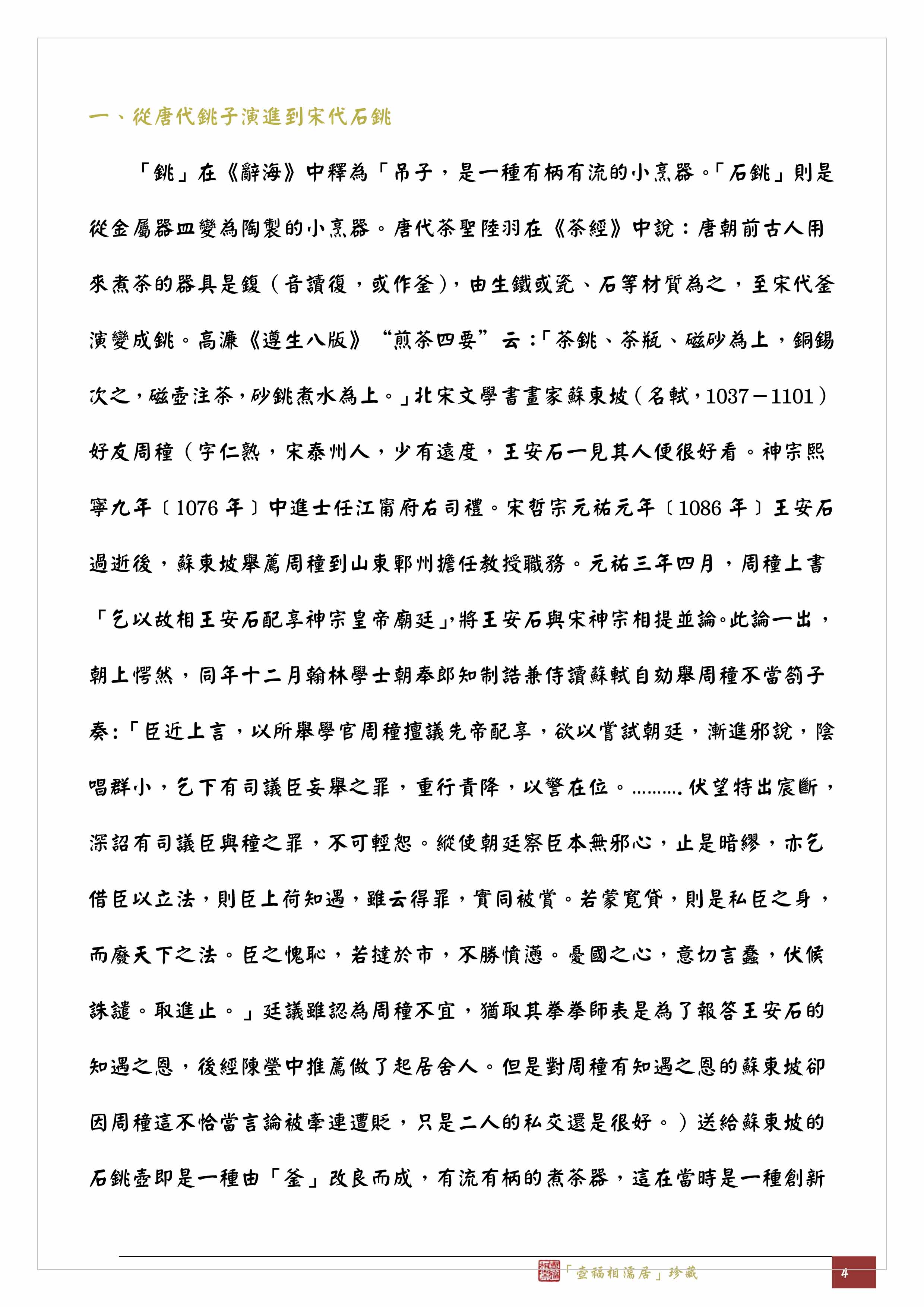 「銚」在《辭海》中釋為「吊子,是一種有柄有流的小烹器。「石銚」則是從金屬器皿變為陶製的小烹器。唐代茶聖陸羽在《茶經》中說:唐朝前古人用來煮茶的器具是鍑(音讀復,或作釜),由生鐵或瓷、石等材質為之,至宋代釜演變成銚。高濂《遵生八版》“煎茶四要”云:「茶銚、茶瓶、磁砂為上,銅錫次之,磁壺注茶,砂銚煮水為上。」北宋文學書畫家蘇東坡(名軾,1037-1101)好友周穜(字仁熟,宋泰州人,少有遠度,王安石一見其人便很好看。神宗熙寧九年﹝l076年﹞中進士任江甯府右司禮。宋哲宗元祐元年﹝1086年﹞王安石過逝後,蘇東坡舉薦周穜到山東鄆州擔任教授職務。元祐三年四月,周穜上書「乞以故相王安石配享神宗皇帝廟廷」,將王安石與宋神宗相提並論。此論一出,朝上愕然,同年十二月翰林學士朝奉郎知制誥兼侍讀蘇軾自劾舉周穜不當劄子奏:「臣近上言,以所舉學官周穜擅議先帝配享,欲以嘗試朝廷,漸進邪說,陰唱群小,乞下有司議臣妄舉之罪,重行責降,以警在位。……….伏望特出宸斷,深詔有司議臣與穜之罪,不可輕恕。縱使朝廷察臣本無邪心,止是暗繆,亦乞借臣以立法,則臣上荷知遇,雖云得罪,實同被賞。若蒙寬貸,則是私臣之身,而廢天下之法。臣之愧恥,若撻於市,不勝憤懣。憂國之心,意切言蠢,伏候誅譴。取進止。」廷議雖認為周穜不宜,猶取其拳拳師表是為了報答王安石的知遇之恩,後經陳瑩中推薦做了起居舍人。但是對周穜有知遇之恩的蘇東坡卻因周穜這不恰當言論被牽連遭貶,只是二人的私交還是很好。)送給蘇東坡的石銚壺即是一種由「釜」改良而成,有流有柄的煮茶器,這在當時是一種創新壺樣,十分合用,所以蘇東坡在得到這一石銚壺之後特別作了一首詩《次韻周穜惠石銚》表達感謝之意:「銅腥鐵澀不宜泉,愛此蒼然深且寬;蟹眼翻波湯已作,龍頭拒火柄猶寒。姜新鹽少茶初熟,水漬雲蒸蘚未乾;自古函牛多折足,要知無腳是輕安。」