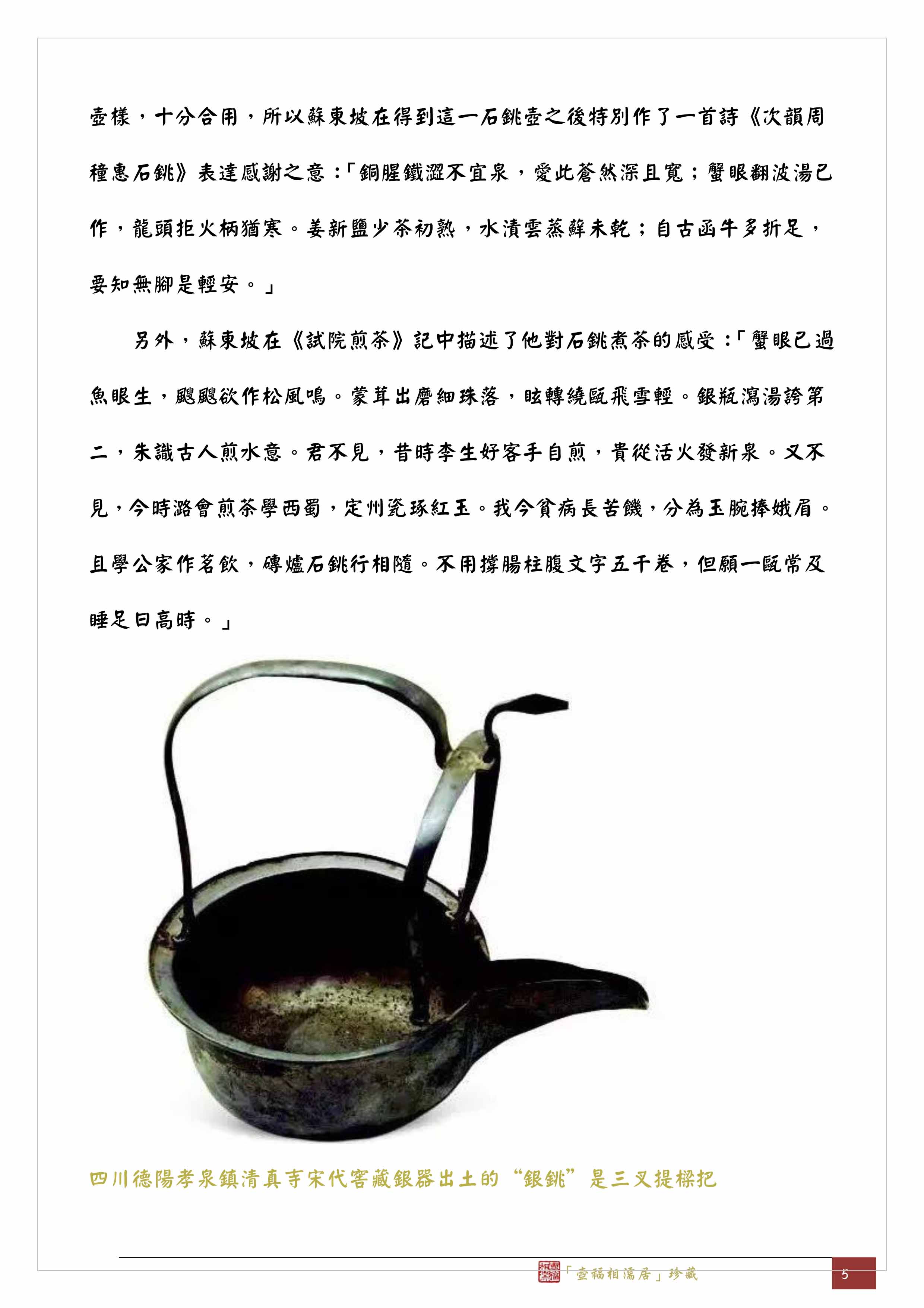 另外,蘇東坡在《試院煎茶》記中描述了他對石銚煮茶的感受:「蟹眼已過魚眼生,颼颼欲作松風鳴。蒙茸出磨細珠落,眩轉繞甌飛雪輕。銀瓶瀉湯誇第二,朱識古人煎水意。君不見,昔時李生好客手自煎,貴從活火發新泉。又不見,今時潞會煎茶學西蜀,定州瓷琢紅玉。我今貧病長苦饑,分為玉腕捧娥眉。且學公家作茗飲,磚爐石銚行相隨。不用撐腸柱腹文字五千卷,但願一甌常及睡足日高時。」
