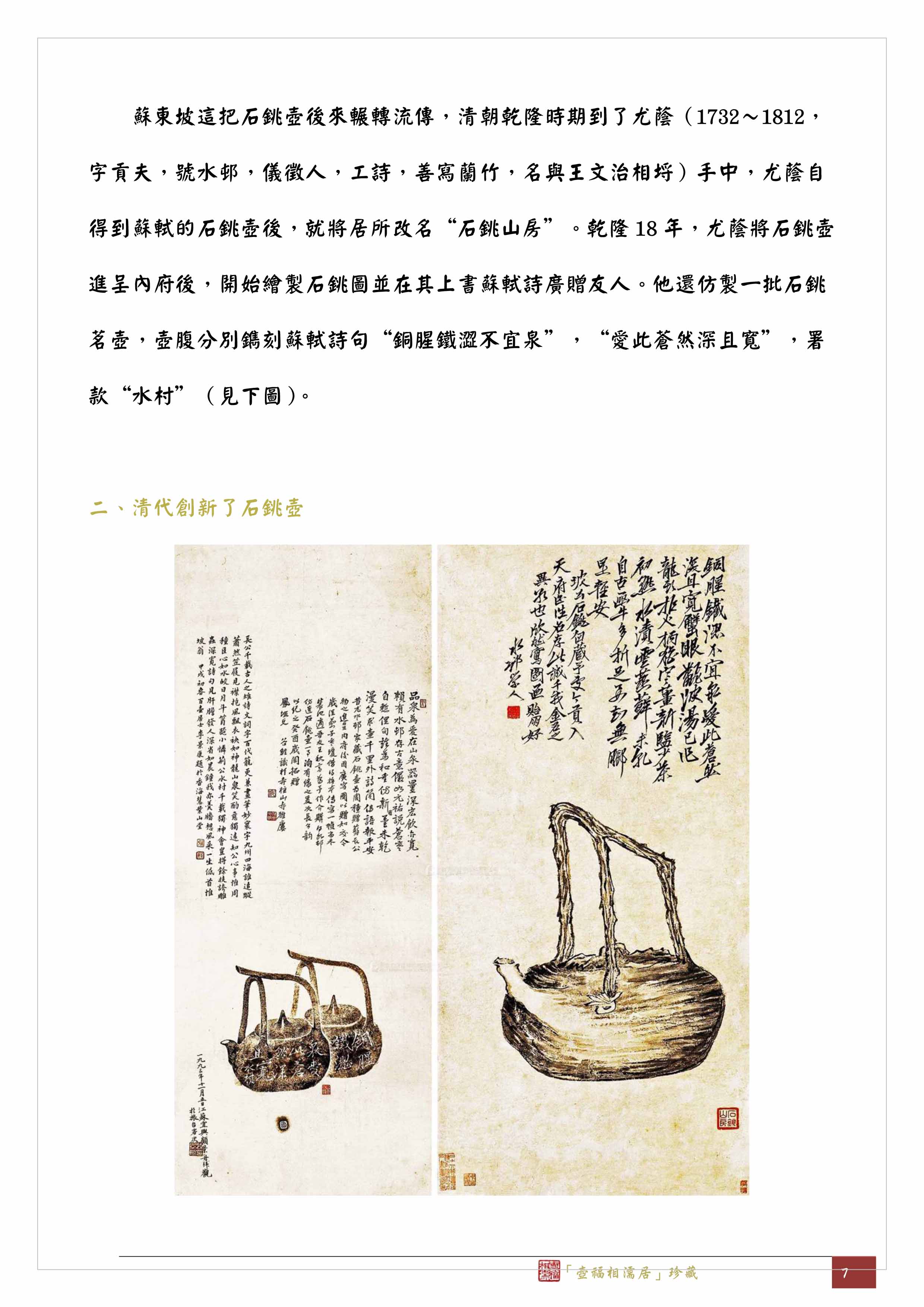 蘇東坡這把石銚壺後來輾轉流傳,清朝乾隆時期到了尤蔭(1732〜1812,字貢夫,號水邨,儀徵人,工詩,善寫蘭竹,名與王文治相埒)手中,尤蔭自得到蘇軾的石銚壺後,就將居所改名“石銚山房”。乾隆18年,尤蔭將石銚壺進呈內府後,開始繪製石銚圖並在其上書蘇軾詩廣贈友人。他還仿製一批石銚茗壺,壺腹分別鐫刻蘇軾詩句“銅腥鐵澀不宜泉”,“愛此蒼然深且寬”,署款“水村”(見下圖)。