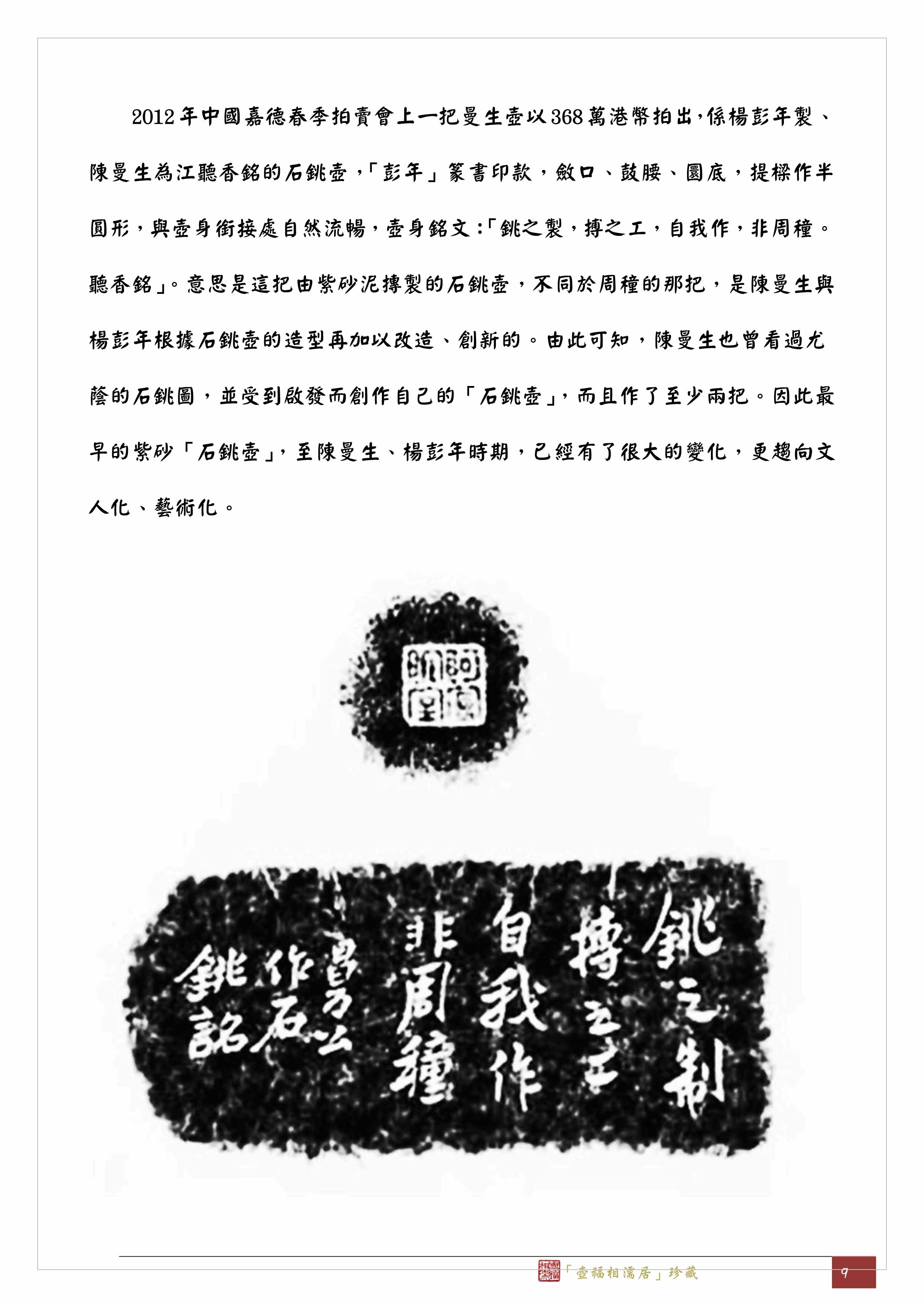 2012年中國嘉德春季拍賣會上一把曼生壺以368萬港幣拍出,係楊彭年製、陳曼生為江聽香銘的石銚壺,「彭年」篆書印款,斂口、鼓腰、圜底,提樑作半圓形,與壺身銜接處自然流暢,壺身銘文:「銚之製,搏之工,自我作,非周穜。聽香銘」。意思是這把由紫砂泥摶製的石銚壺,不同於周穜的那把,是陳曼生與楊彭年根據石銚壺的造型再加以改造、創新的。由此可知,陳曼生也曾看過尤蔭的石銚圖,並受到啟發而創作自己的「石銚壺」,而且作了至少兩把。因此最早的紫砂「石銚壺」,至陳曼生、楊彭年時期,已經有了很大的變化,更趨向文人化、藝術化。