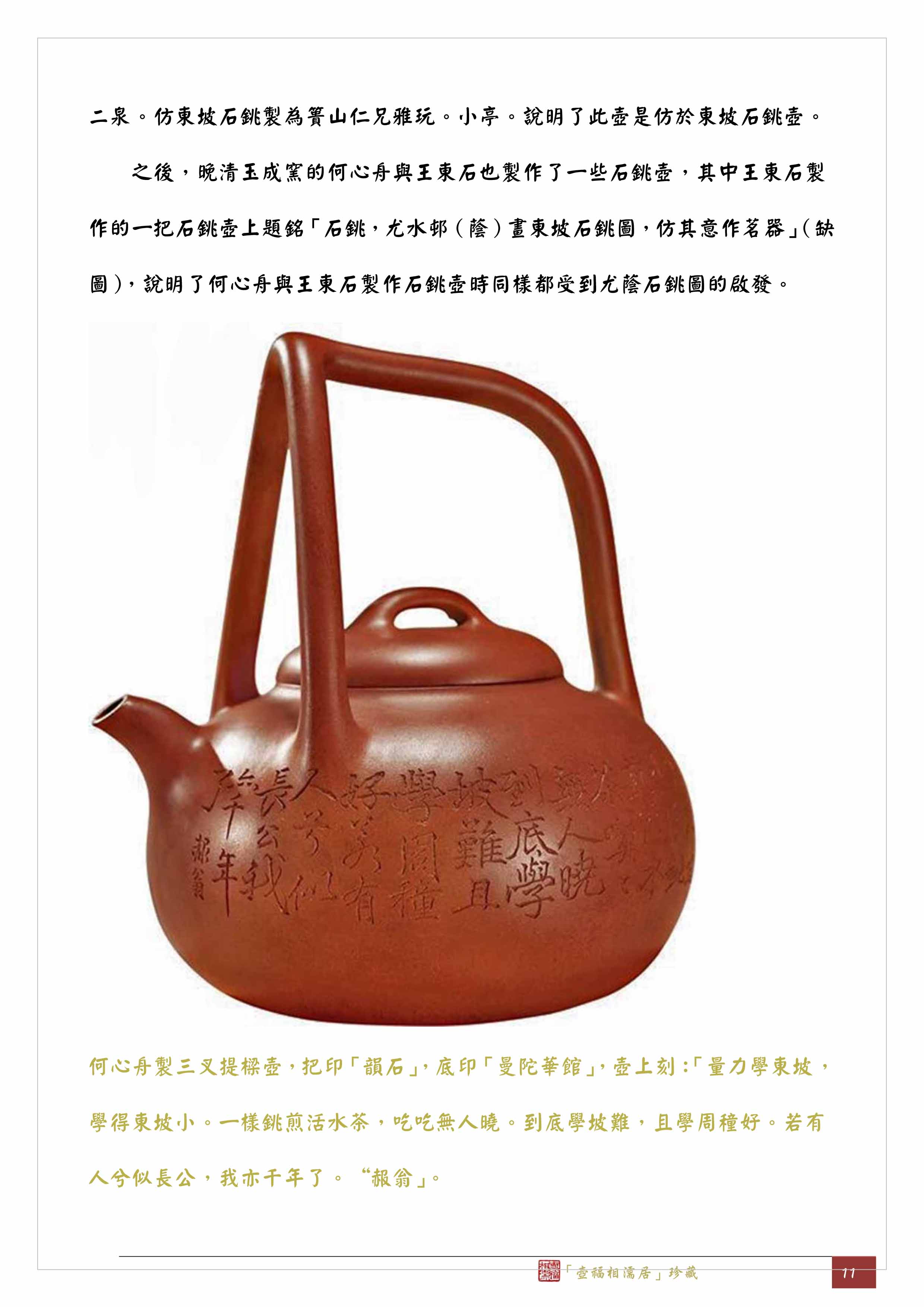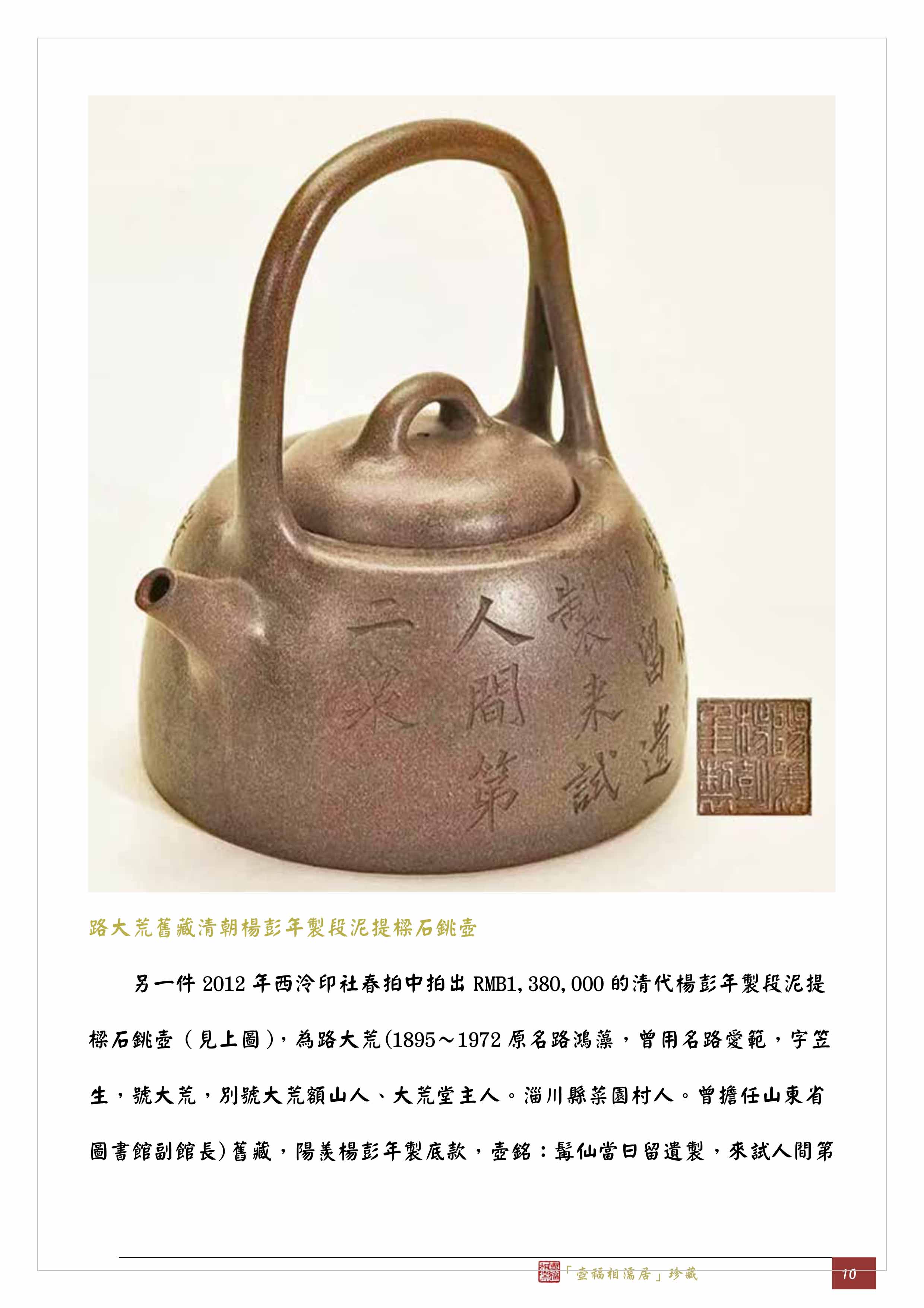 另一件2012年西泠印社春拍中拍出RMB1,380,000的清代楊彭年製段泥提樑石銚壺(見上圖),為路大荒(1895~1972原名路鴻藻,曾用名路愛範,字笠生,號大荒,別號大荒額山人、大荒堂主人。淄川縣菜園村人。曾擔任山東省圖書館副館長)舊藏,陽羨楊彭年製底款,壺銘:髯仙當日留遺製,來試人間第二泉。仿東坡石銚製為簣山仁兄雅玩。小亭。說明了此壺是仿於東坡石銚壺。