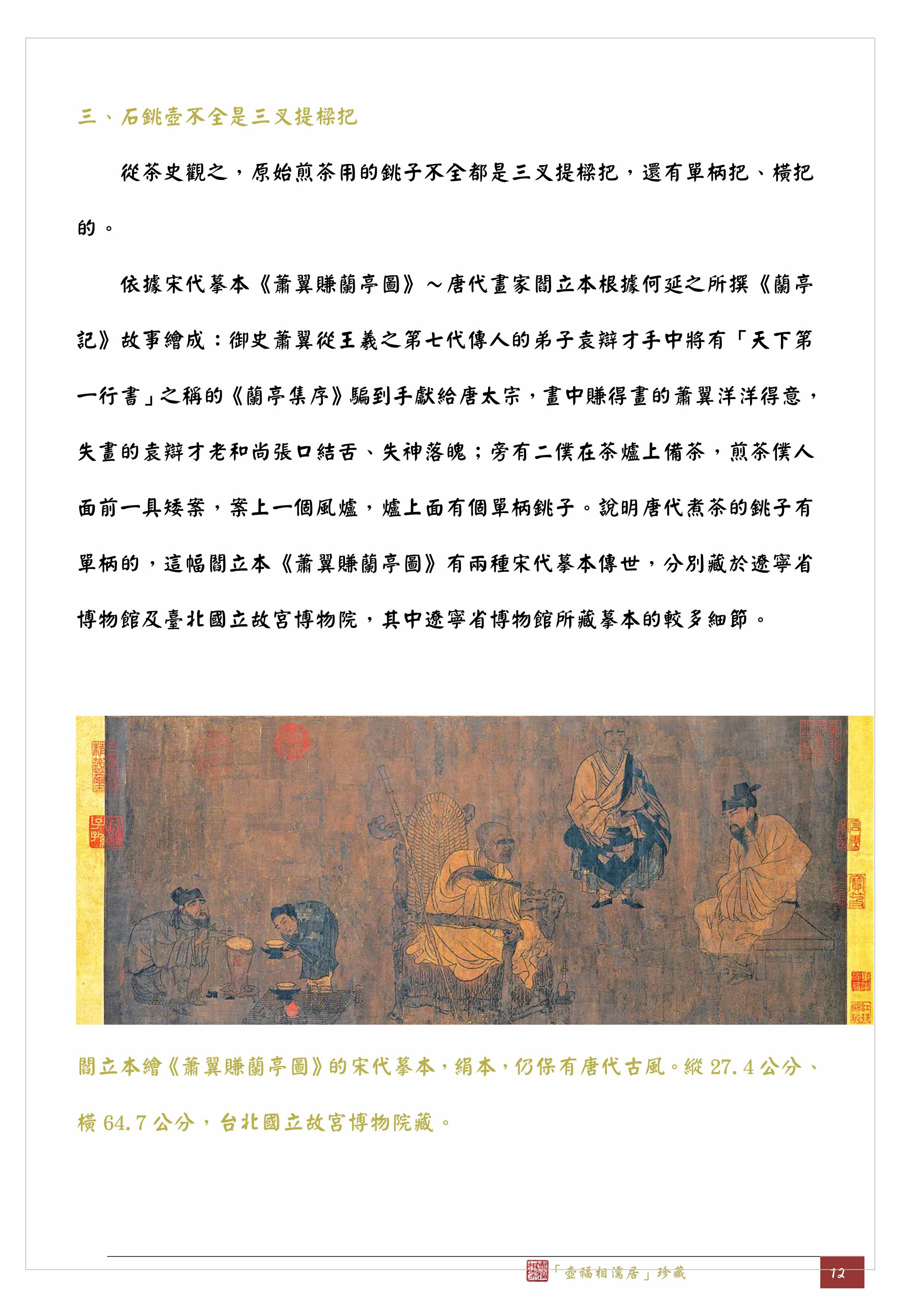 依據宋代摹本《蕭翼賺蘭亭圖》~唐代畫家閻立本根據何延之所撰《蘭亭記》故事繪成:御史蕭翼從王羲之第七代傳人的弟子袁辯才手中將有「天下第一行書」之稱的《蘭亭集序》騙到手獻給唐太宗,畫中賺得畫的蕭翼洋洋得意,失畫的袁辯才老和尚張口結舌、失神落魄;旁有二僕在茶爐上備茶,煎茶僕人面前一具矮案,案上一個風爐,爐上面有個單柄銚子。說明唐代煮茶的銚子有單柄的,這幅閻立本《蕭翼賺蘭亭圖》有兩種宋代摹本傳世,分別藏於遼寧省博物館及臺北國立故宮博物院,其中遼寧省博物館所藏摹本的較多細節。