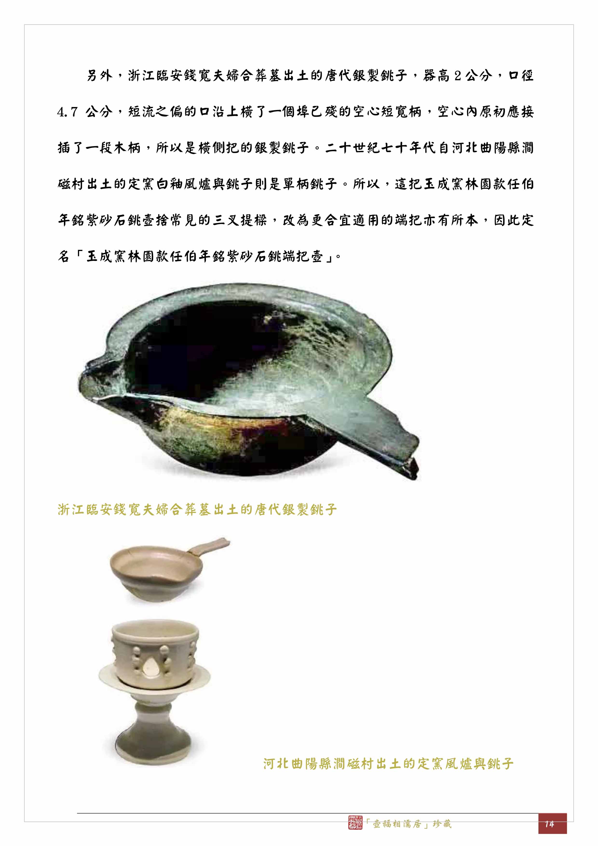 另外,浙江臨安錢寬夫婦合葬墓出土的唐代銀製銚子,器高2公分,口徑4.7 公分,短流之偏的口沿上橫了一個埠已殘的空心短寬柄,空心內原初應接插了一段木柄,所以是橫側把的銀製銚子。二十世紀七十年代自河北曲陽縣澗磁村出土的定窯白釉風爐與銚子則是單柄銚子。所以,這把玉成窯林園款任伯年銘紫砂石銚壺捨常見的三叉提樑,改為更合宜適用的端把亦有所本,因此定名「玉成窯林園款任伯年銘紫砂石銚端把壺」。