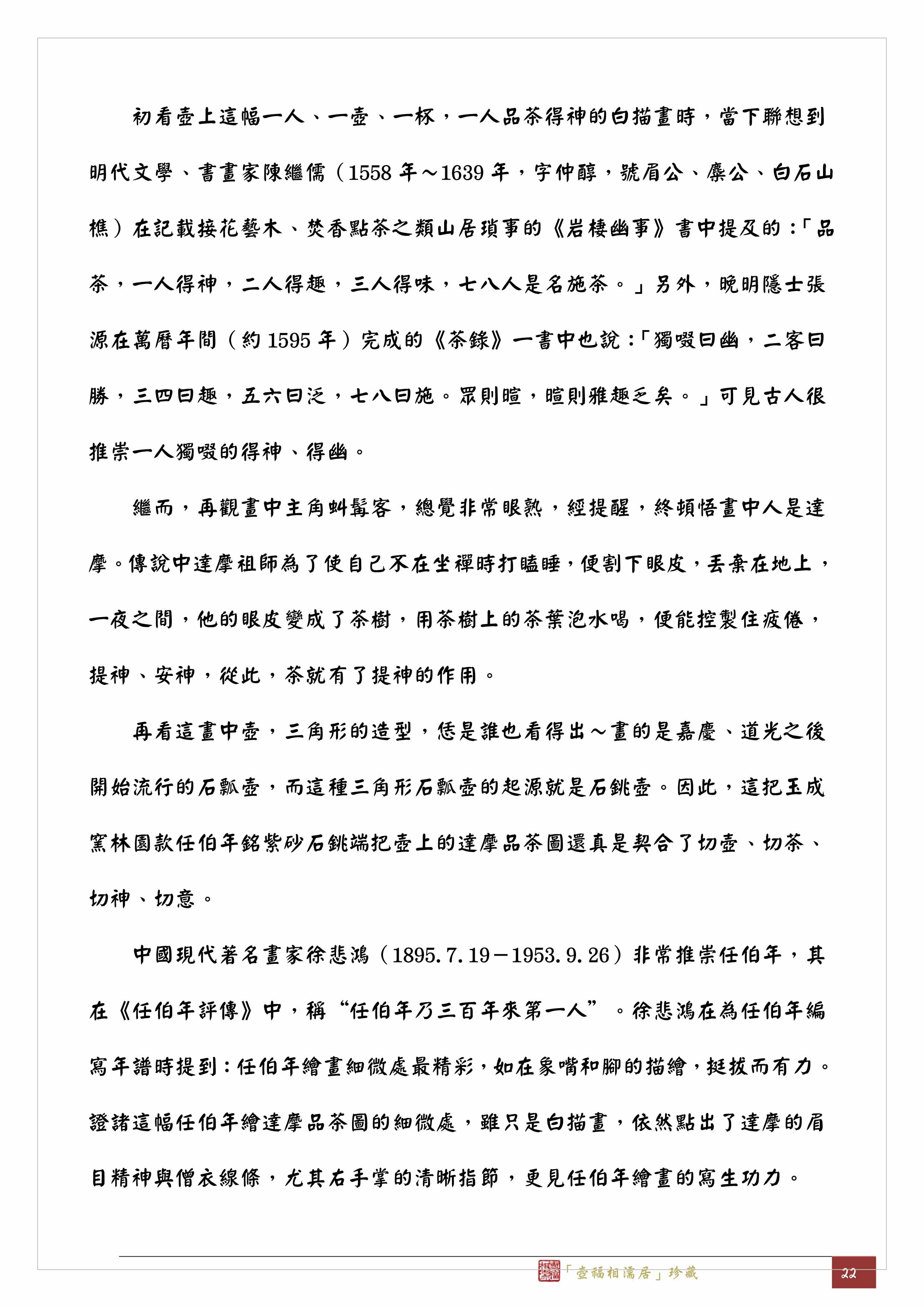 初看壺上這幅一人、一壺、一杯,一人品茶得神的白描畫時,當下聯想到明代文學、書畫家陳繼儒(1558年~1639年,字仲醇,號眉公、麋公、白石山樵)在記載接花藝木、焚香點茶之類山居瑣事的《岩棲幽事》書中提及的:「品茶,一人得神,二人得趣,三人得味,七八人是名施茶。」另外,晚明隱士張源在萬曆年間(約1595年)完成的《茶錄》一書中也說:「獨啜曰幽,二客曰勝,三四曰趣,五六曰泛,七八曰施。眾則暄,暄則雅趣乏矣。」可見古人很推崇一人獨啜的得神、得幽。