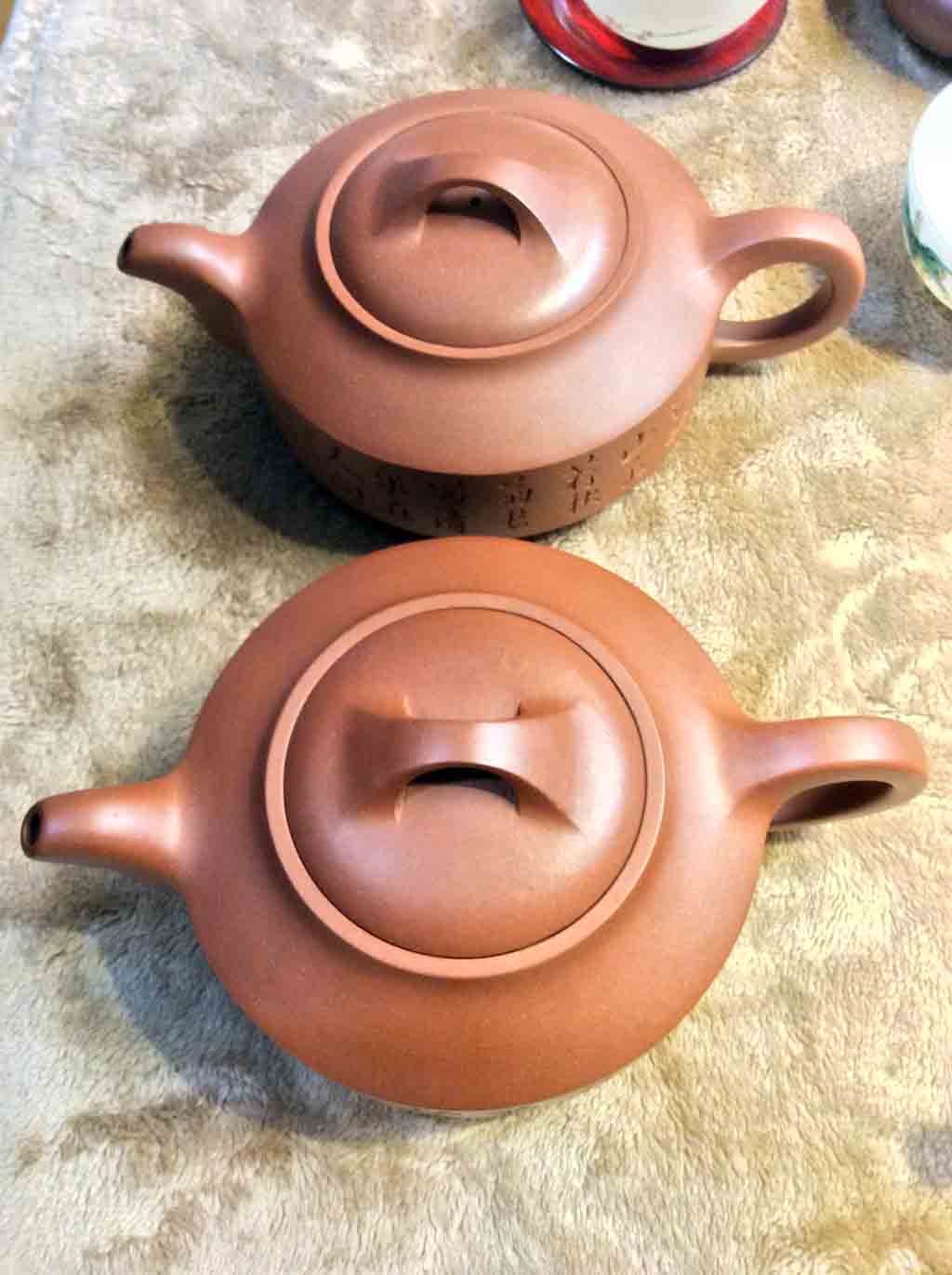 經過一番比對,先淘汰「墨緣齋景堂製」款「紫砂倒把西施壺」與「陽羨惜陰室王」款「鑲金朱泥水平壺」,儘管這2把的做工很好,但是泥質太新,不符合1920~1930年代的紫砂特徵。