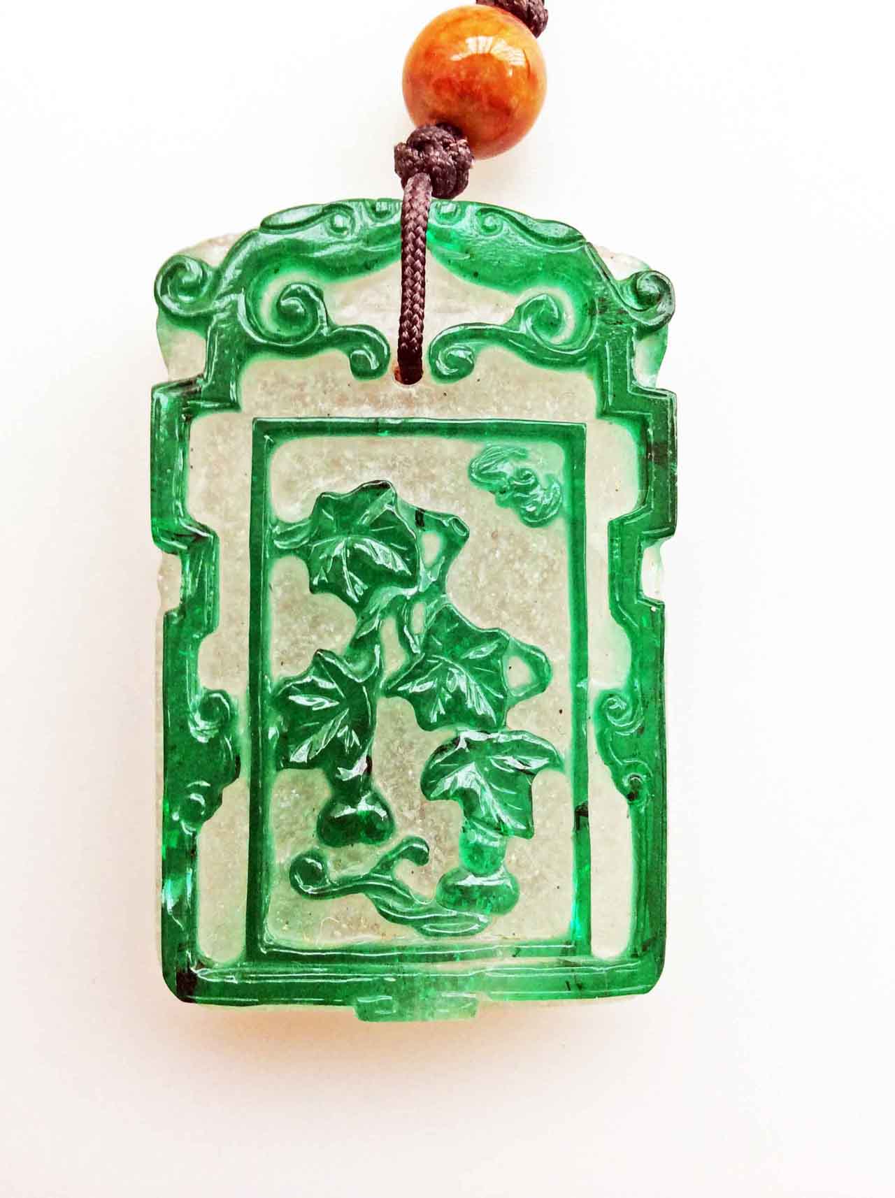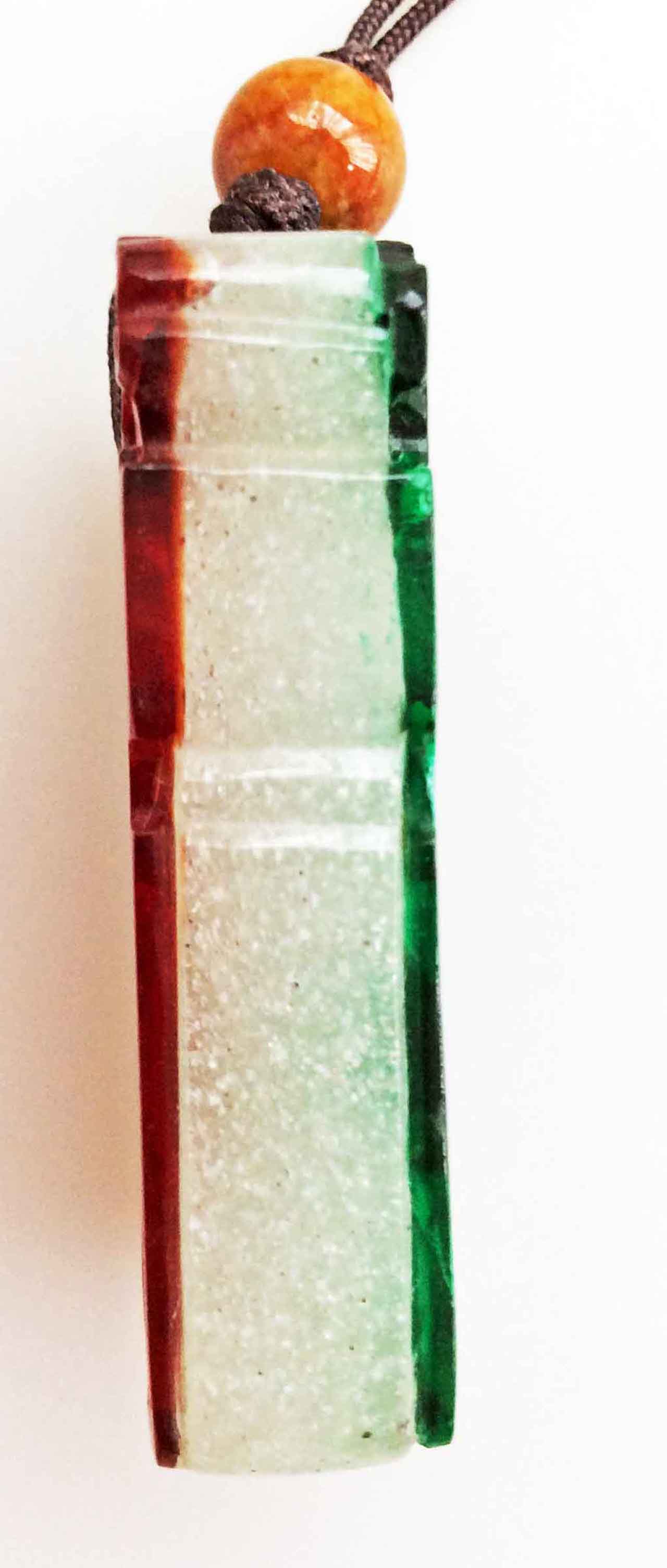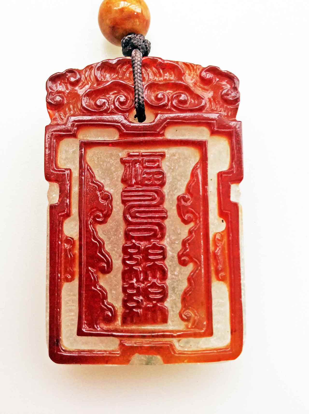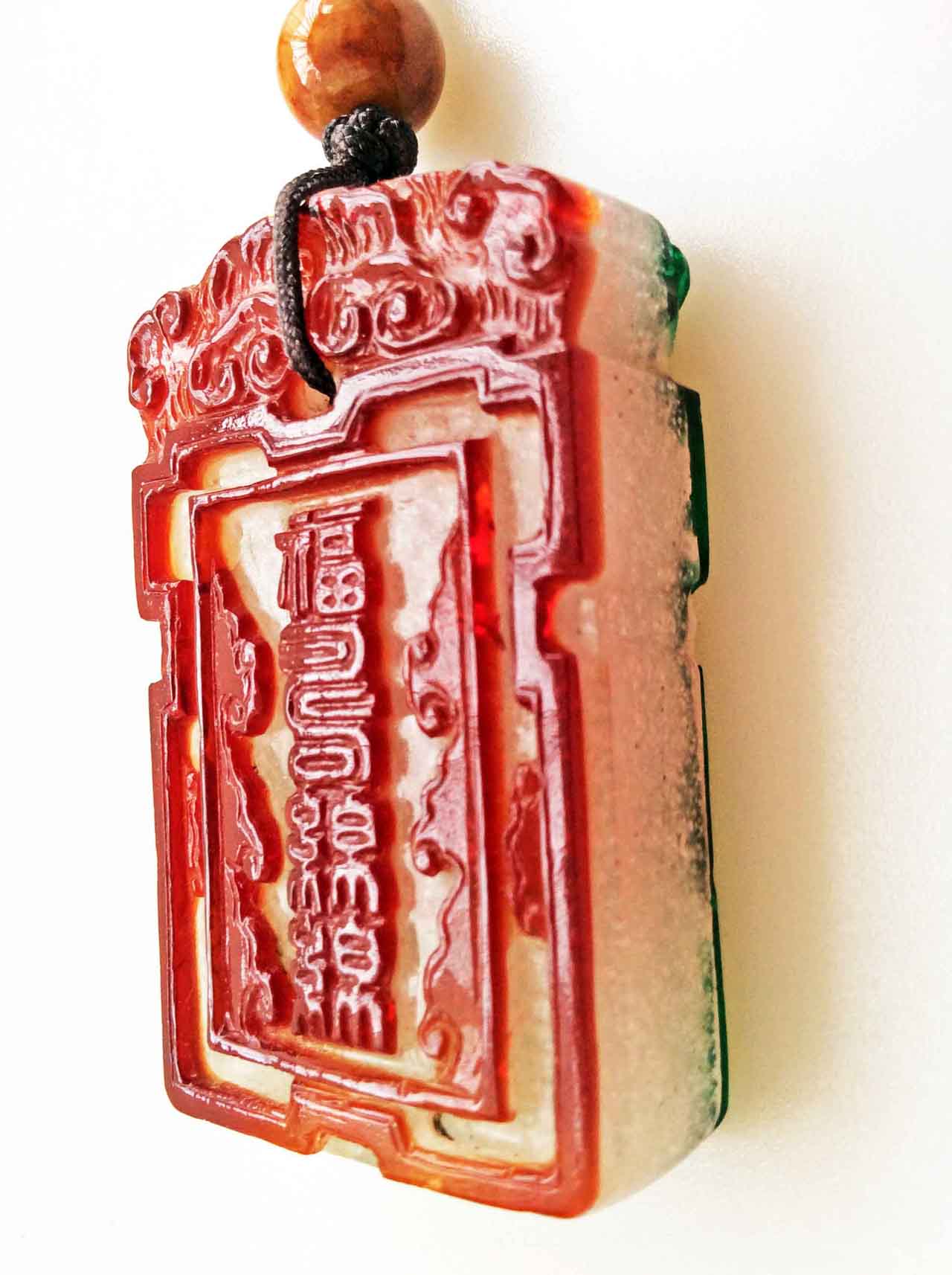 這是一枚少見的清代套料吉語子剛牌,中層為涅白琉璃,一面套翠綠色料,上鐫刻拐子龍紋及福在眼前圖;一面套褐紅色料,上鐫刻雲頭紋與福壽綿綿吉語。褐紅、翠綠兩種色料都是分次套黏在涅白琉璃上,待色料硬化後再以雕玉技法琢刻成圖案。
