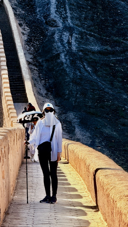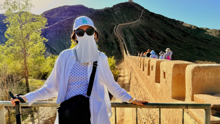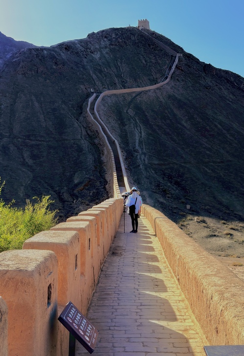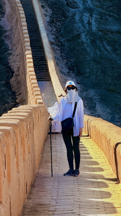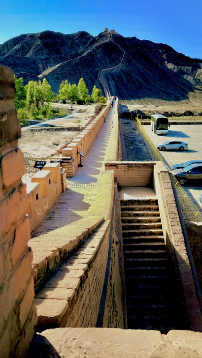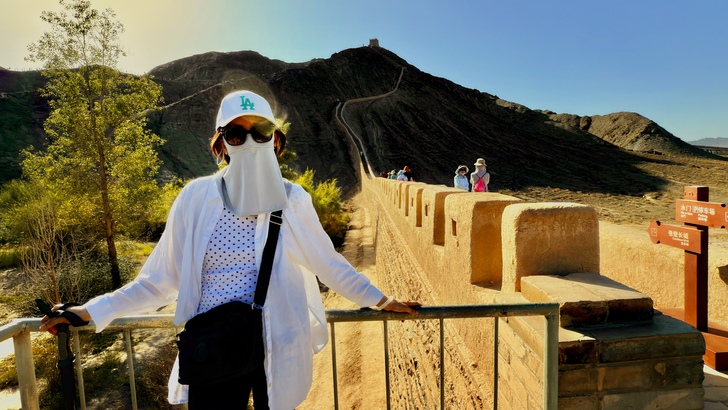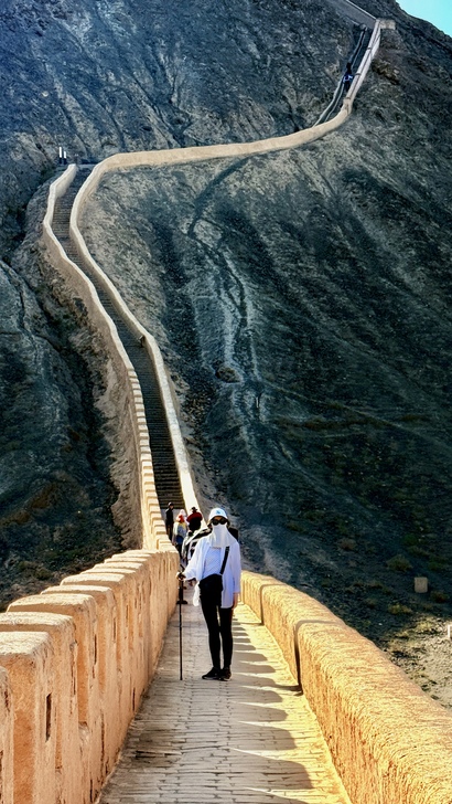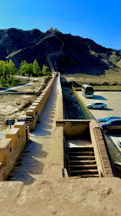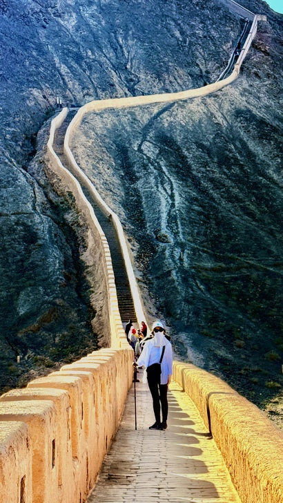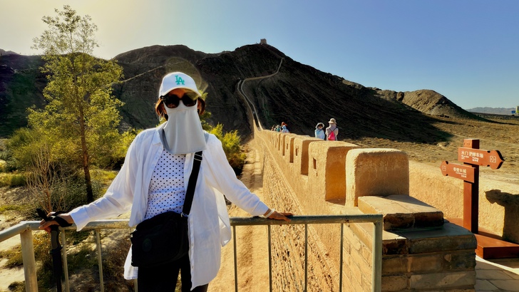 2025年8月31日下午五時許,我們這群遊北疆與絲路的一行人,到了一個大約只要一個半小時就可以參觀完的景點~懸壁長城,也按計劃在二個鐘頭內遊完了。當時艷陽高照,雖然覺得這段長城的氣勢雄偉,但是在無遮攔炙陽的照射之下,只覺得應該趕快找個可遮陽的陰涼地方去避暑,因此我只走到長城的山腳下就回頭了,同行人之中多半走到半山腰上就折返,只有少數幾位登上頂峰的烽火台。