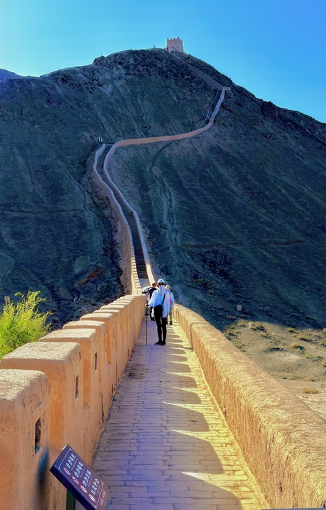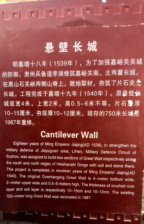 嘉峪關長城的「懸壁長城」段,位於甘肅省嘉峪關市城北約8公里處,座落在黑山北麓,全段長城順著黑山的山脊蜿蜒而上,地勢險峻、山體陡峭,最陡峭處坡度達45度以上,