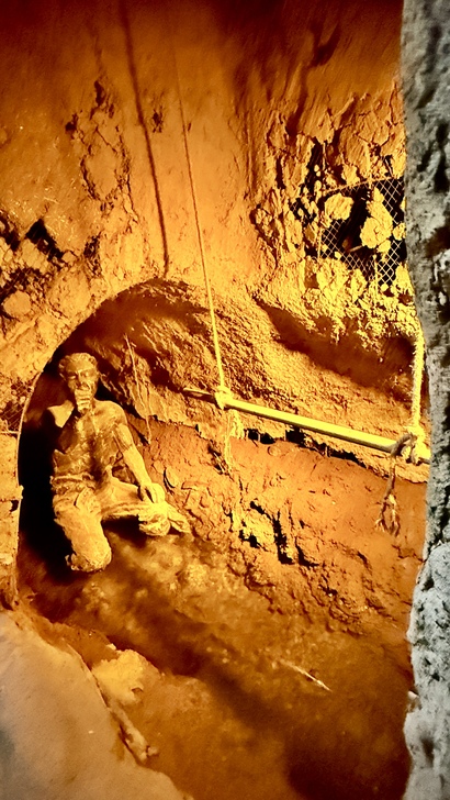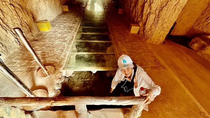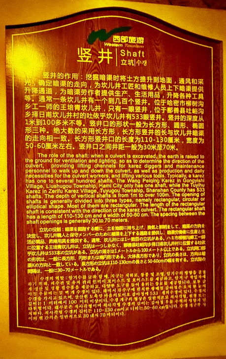 2. 每條坎兒井平均長度 2~3 公里,有的長達十餘公里;豎井間距約 20~30 公尺,深度可達 90 公尺。這樣的工程在兩千多年前主要靠人工掘鑿完成,可想見當地人民的毅力與智慧。2025年4月27日,吐魯番市坎兒井樂園景區從事講解工作已有21年的金牌講解員吐爾遜娜依解說挖一條坎兒井需要多長時間?一條暗渠的高度是1.5至1.7米,寬度僅0.6至0.7米,坎兒井的水溫只有攝氏15度,匠人們只能蹲跪甚至趴在冰冷潮濕的水裡掏挖,一天下來也只能掏挖2米的長度,因此挖一條坎兒井需要幾十年,甚至幾代人才能完成!這種沒有工資,也從來不求回報,就是父輩們不畏艱苦、造福子孫後代的精神。吐爾遜娜依的父親胡吉艾合買提·米吉提是一位經驗豐富的坎兒井匠人,1987年夏天,她的父親像往常一樣深入一處60餘米深的坎兒井進行開挖、修復的工作時,繩子突然斷了,父親從此再也沒有上來。也就是從那時起,吐爾遜娜依才知道坎兒井的每一滴水,都是用無數人的默默付出換來的。