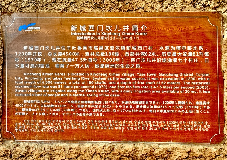 1. 吐魯番坎兒井長度驚人、結構精密,全區現存坎兒井約1100條左右(早期最多時達1800條),總長度超過 5000公里,豎井總數達數十萬口,出水量3億立方米,約佔吐魯番地區供水量的30%。