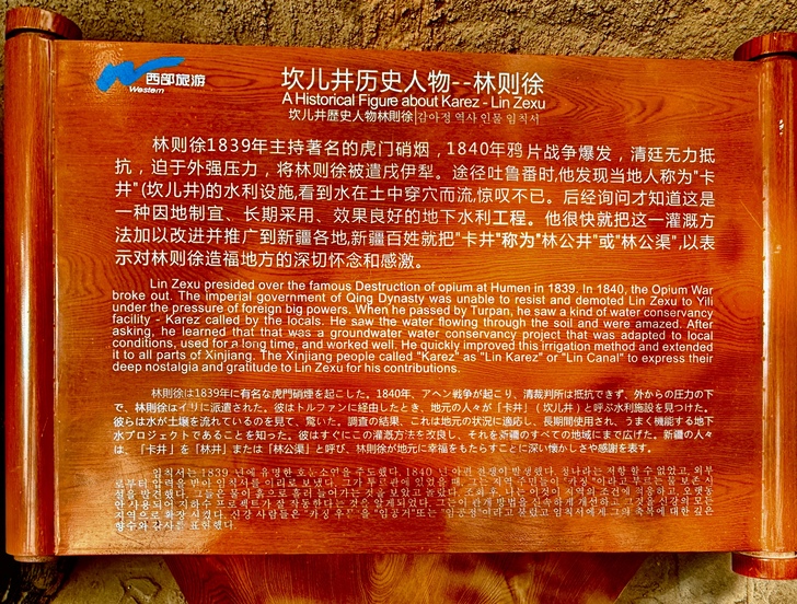 林則徐1839年主持著名的虎門銷毁鴉片,1840年鴉片戰爭爆發,清廷無力抵抗,迫於外強壓力,將林則徐遣戍伊犁。途經吐魯番時,他發現當地人稱為“卡井"(坎兒井)的水利設施,看到水在土中穿穴而流驚嘆不已。後經詢問才知道這是一種因地制宜、長期採用、效果良好的地下水利工程。他很快就把這一灌溉方法加以改進並推廣到新疆各地,新疆百姓就把”卡井"稱力“林公井“或”林公渠”以表示對林則徐造福地方的深切懷念和感激。