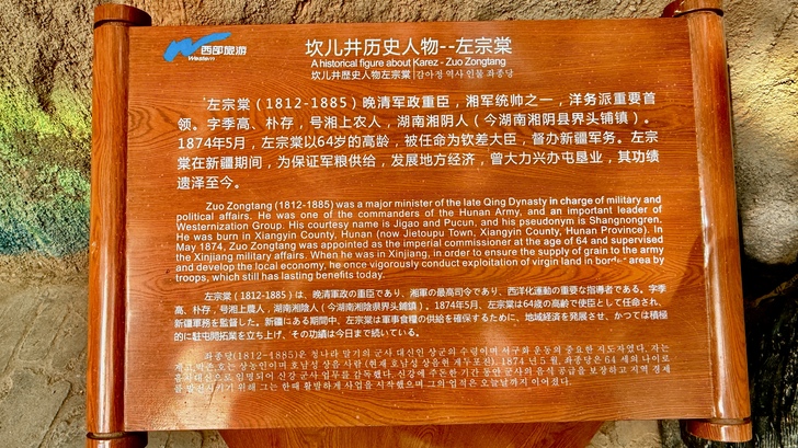 左宗棠(1812-1885年)是晚清軍政重臣,湘軍統帥之一,洋務派重要首領。字季高、樸存,號湘上農人,湖南湘陰人(今湖南湘陰縣界頭鋪鎮)。1874年5月,左宗棠以64歲的高齡,被任命為欽差大臣,督辦新疆軍務。左宗棠在新疆期間,為保證軍糧供給,發展地方經濟,曾大力興辦屯墾業,其中包括加強坎兒井,其功績遺澤至今。