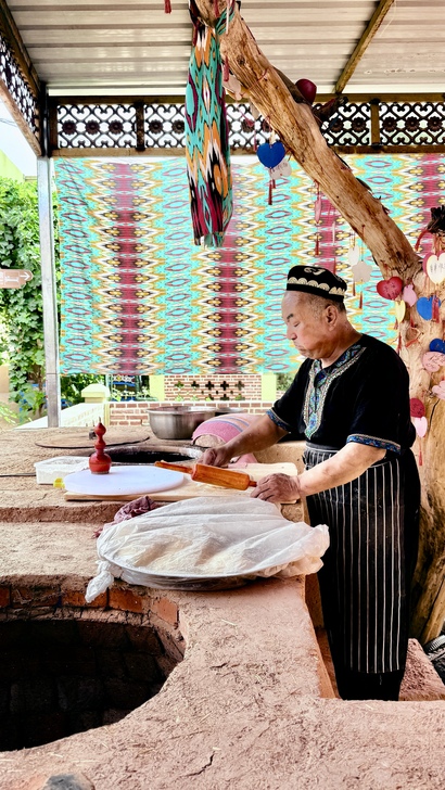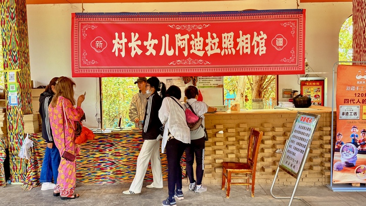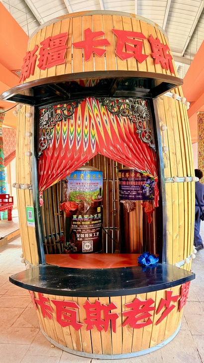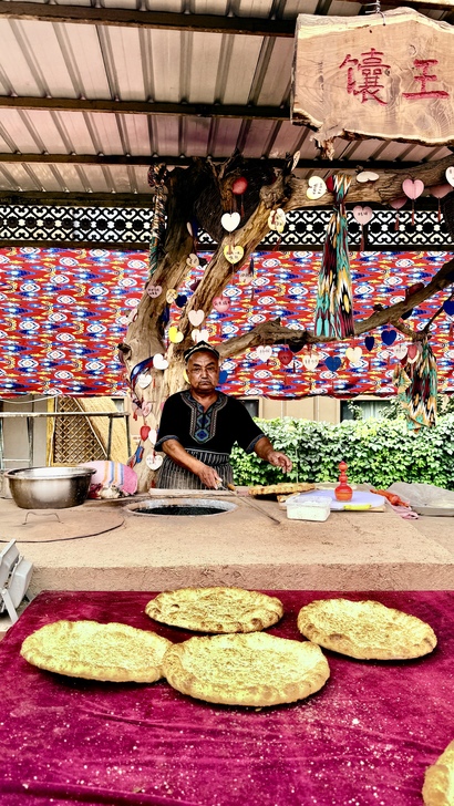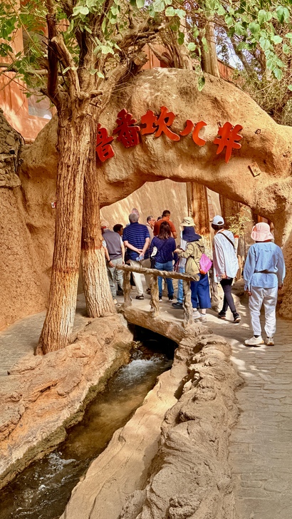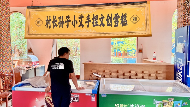 2025年9月4日上午10時許,到新疆「吐魯番坎兒井民俗園」參觀,12時參觀完,走過景點出門之前常有的民俗街與商店街,看到其中三家有趣的商店~村長女兒向迪拉照相館、村長孫子小艾手捏文創雪糕、饢王阿布,其中兩家頂著村長的名銜,是村長第二代的女兒和第三代的孫子開的店,另一個是做維吾爾族主食~饢,可以做到自稱王的「饢王阿布」。前兩家店從第一代的村長、到第二代的女兒、第三代的孫子,三代同堂,除了凸顯村長很有號召力,可以發光協助子孫創業,自力更生,很有生命的延續力,尤其這個「坎兒井民俗園」到今年八月底,已經累積了30萬觀光客,預計到年底會有40萬人到此參觀,是一個炙手可熱的觀光景點,當然會有好的收益。