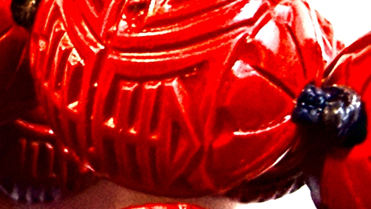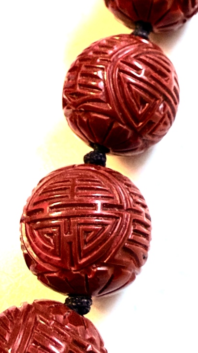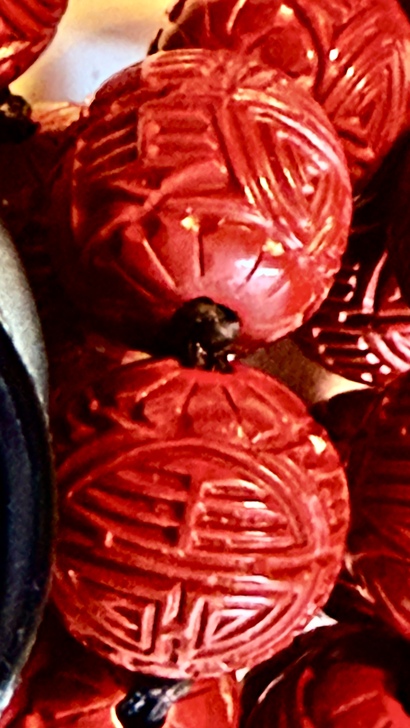 • 為現代仿剔紅工藝珠串,以合成樹脂壓模或雕刻後上亮漆方式製成;