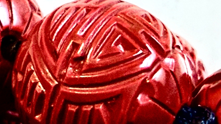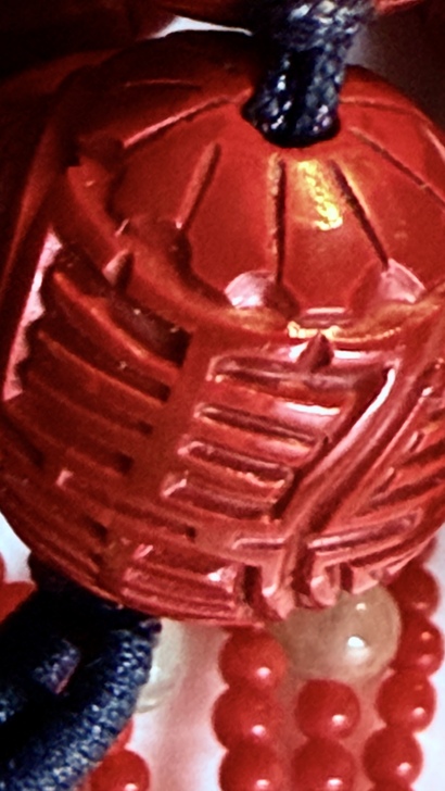 • 珠子呈深紅色,有明顯層狀雕刻痕跡與光澤感。