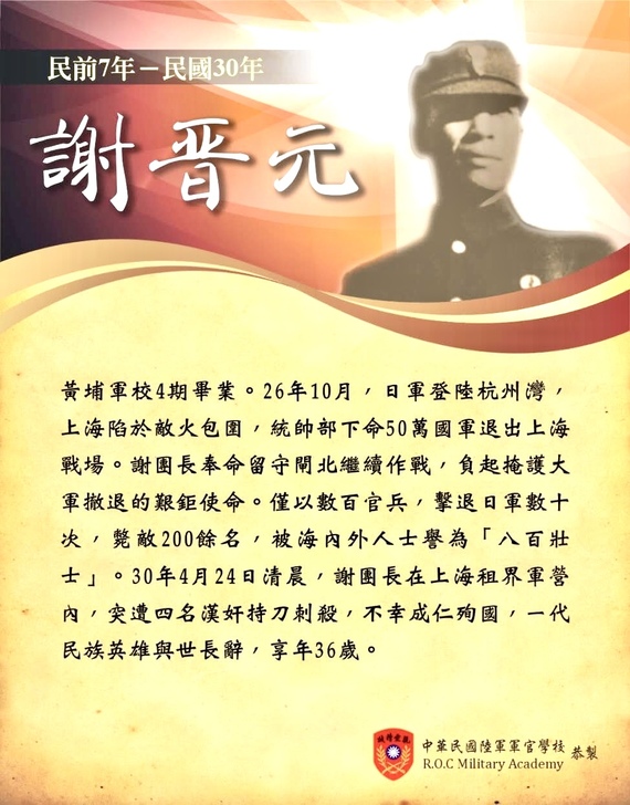 淞滬戰役(又稱八一三戰役)是抗日戰爭初期(1937年8月13日至11月12日)中日兩軍在上海地區爆發的一場大型會戰,中國國民革命軍投入約70萬兵力,與日軍約30萬人展開激烈戰鬥。這場戰役雖然最終以中國軍隊撤退告終,但重創日軍,粉碎了其「三月亡華」的妄想,振奮了民族士氣。其中,最為人津津樂道的插曲便是「四行倉庫保衛戰」,由國民革命軍第88師262旅524團第1營營長謝晉元率領的約400餘名官兵(後被宣傳為「八百壯士」)死守四行倉庫四天四夜,阻擋日軍進攻,為大部隊西撤爭取時間。