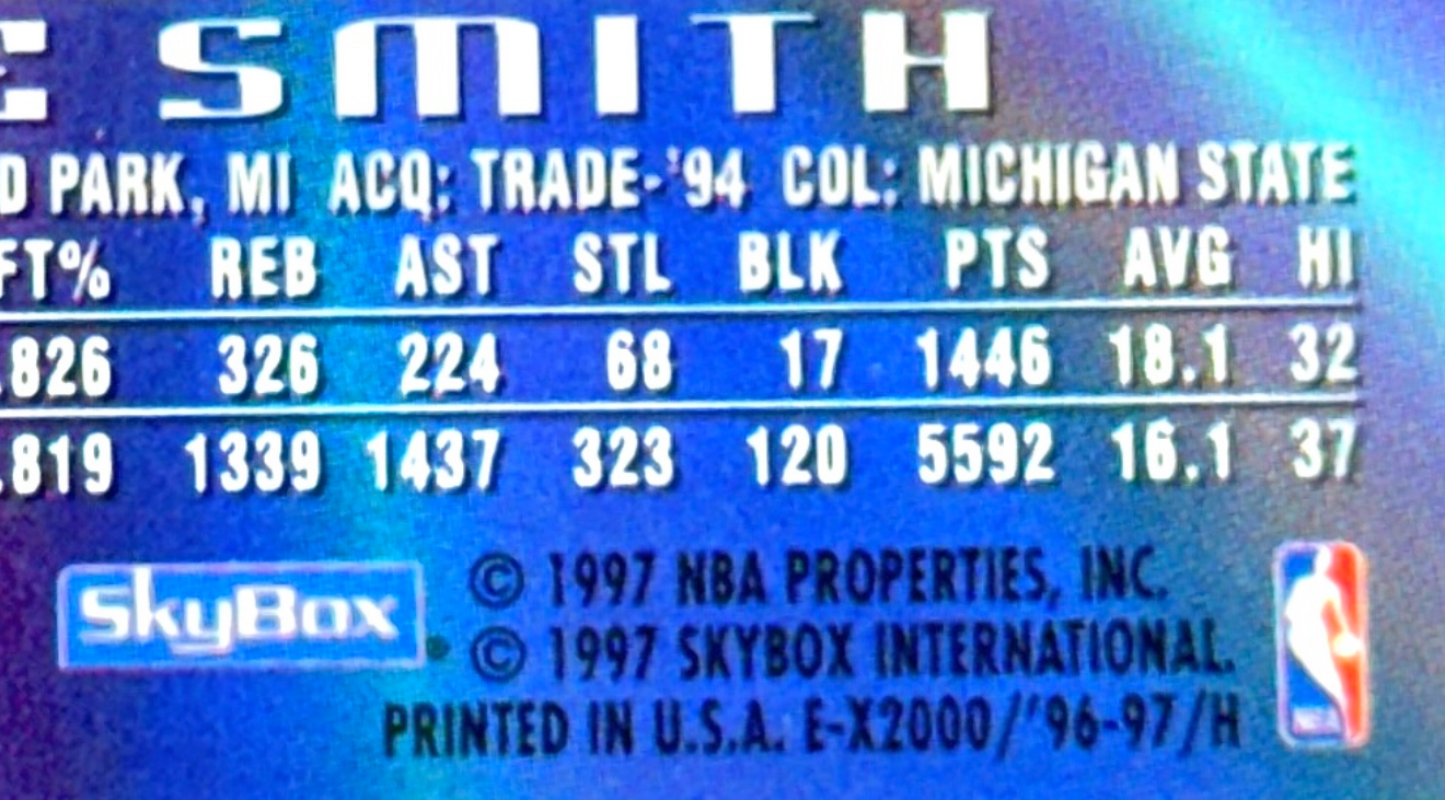• 此卡背面(第二張圖)列出 Smith 在 1995-96 賽季(打 Hawks 時)80場出賽、平均 18.1 分等數據。從背面可見他當時的重要角色。