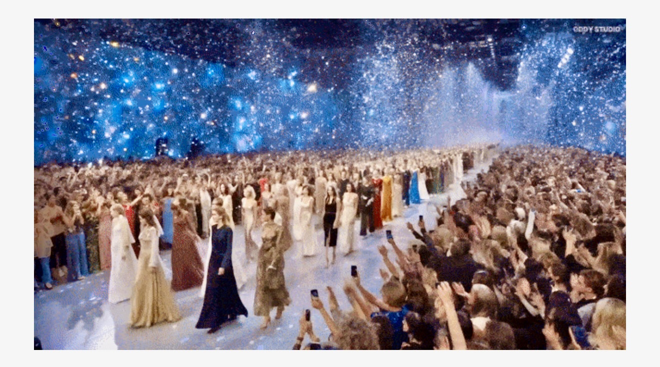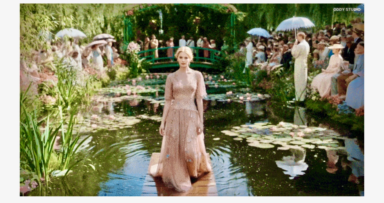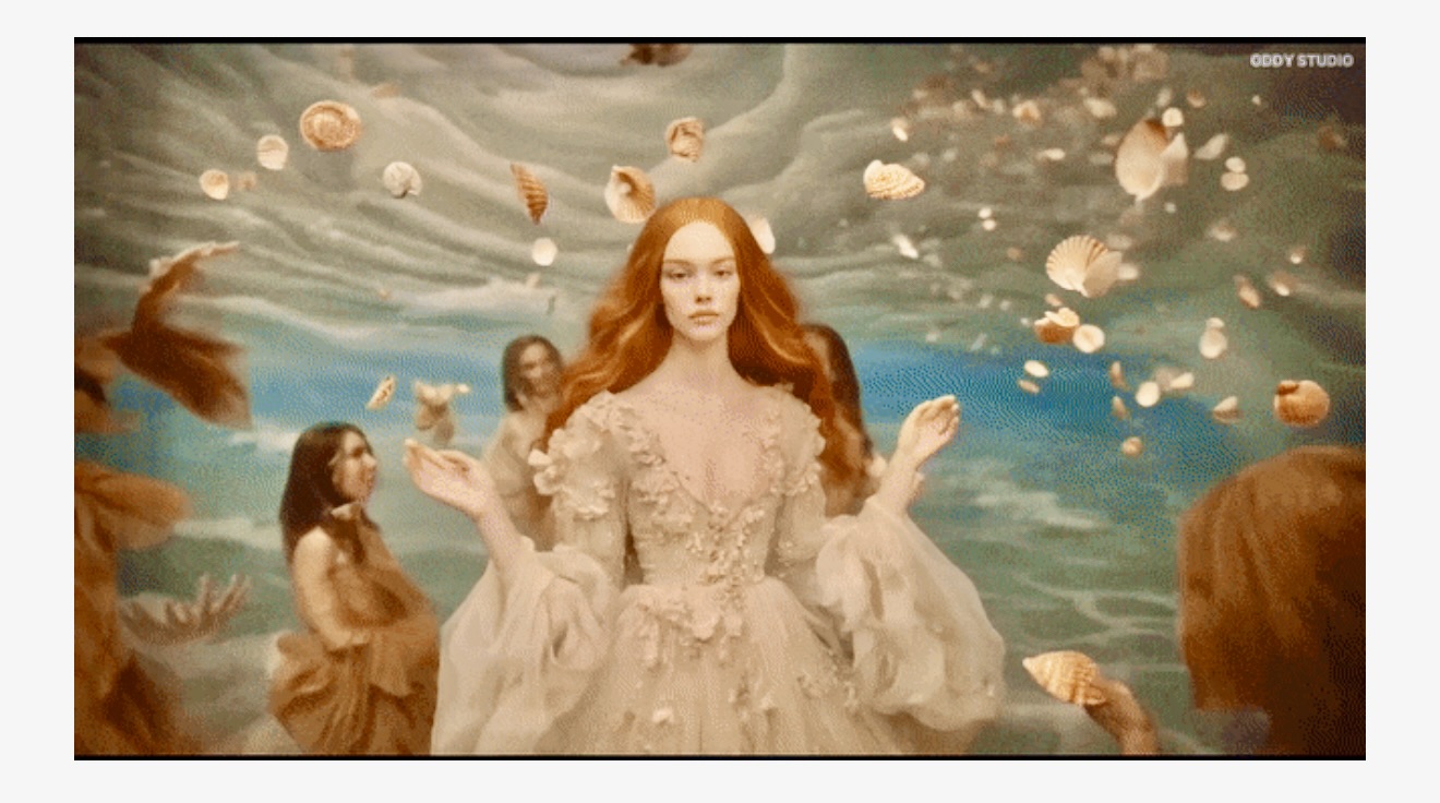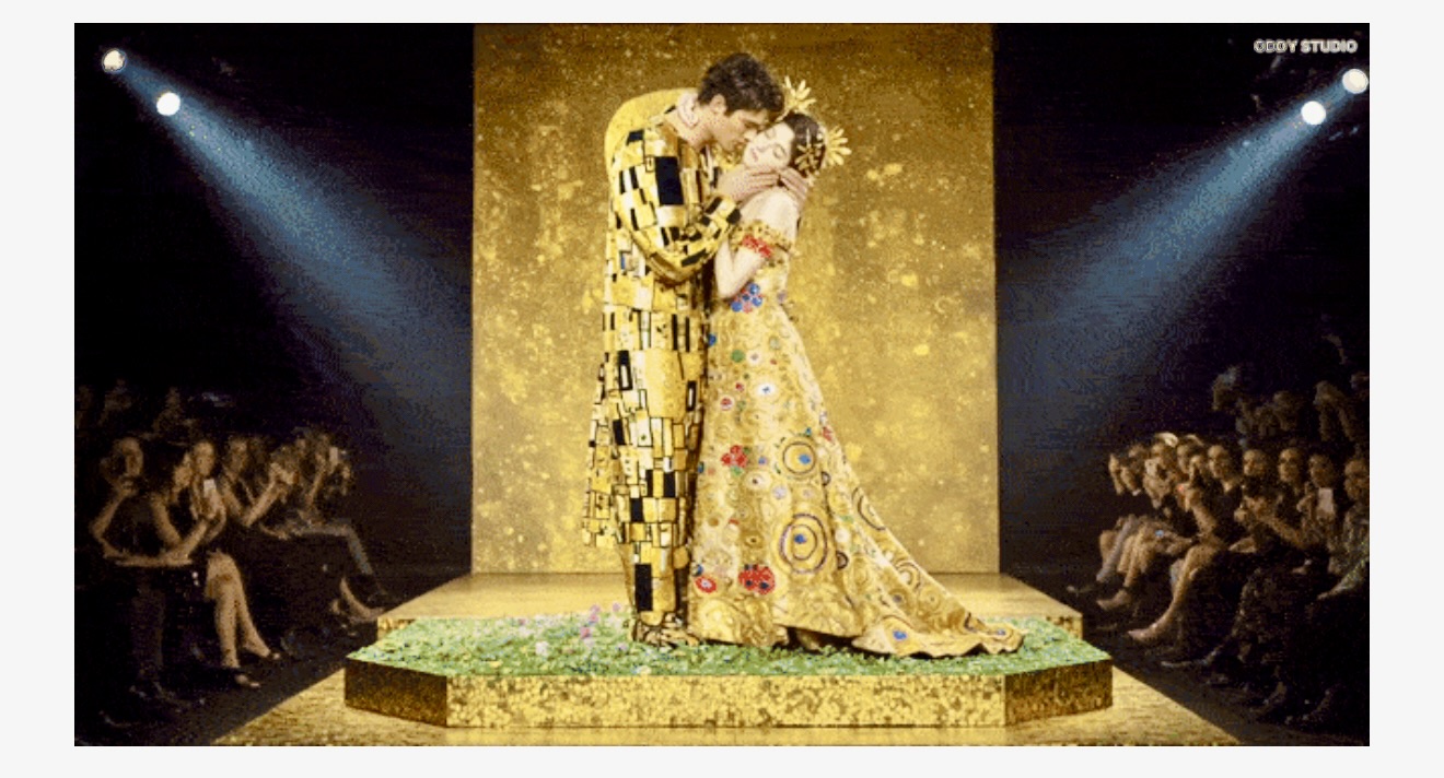 隨後,T台上走出來身著時裝的戴珍珠耳環的少女,維納斯在貝殼中誕生,克里姆特的《吻》被神還原,畫家本人在台下看著這一幕,都被打動了……