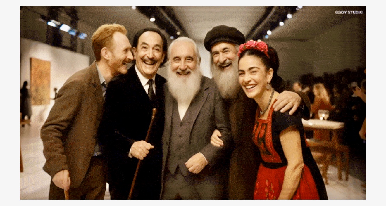 最後一幕,梵高、達利、莫奈、達芬奇、弗里達同台相擁,彼此微笑致意。