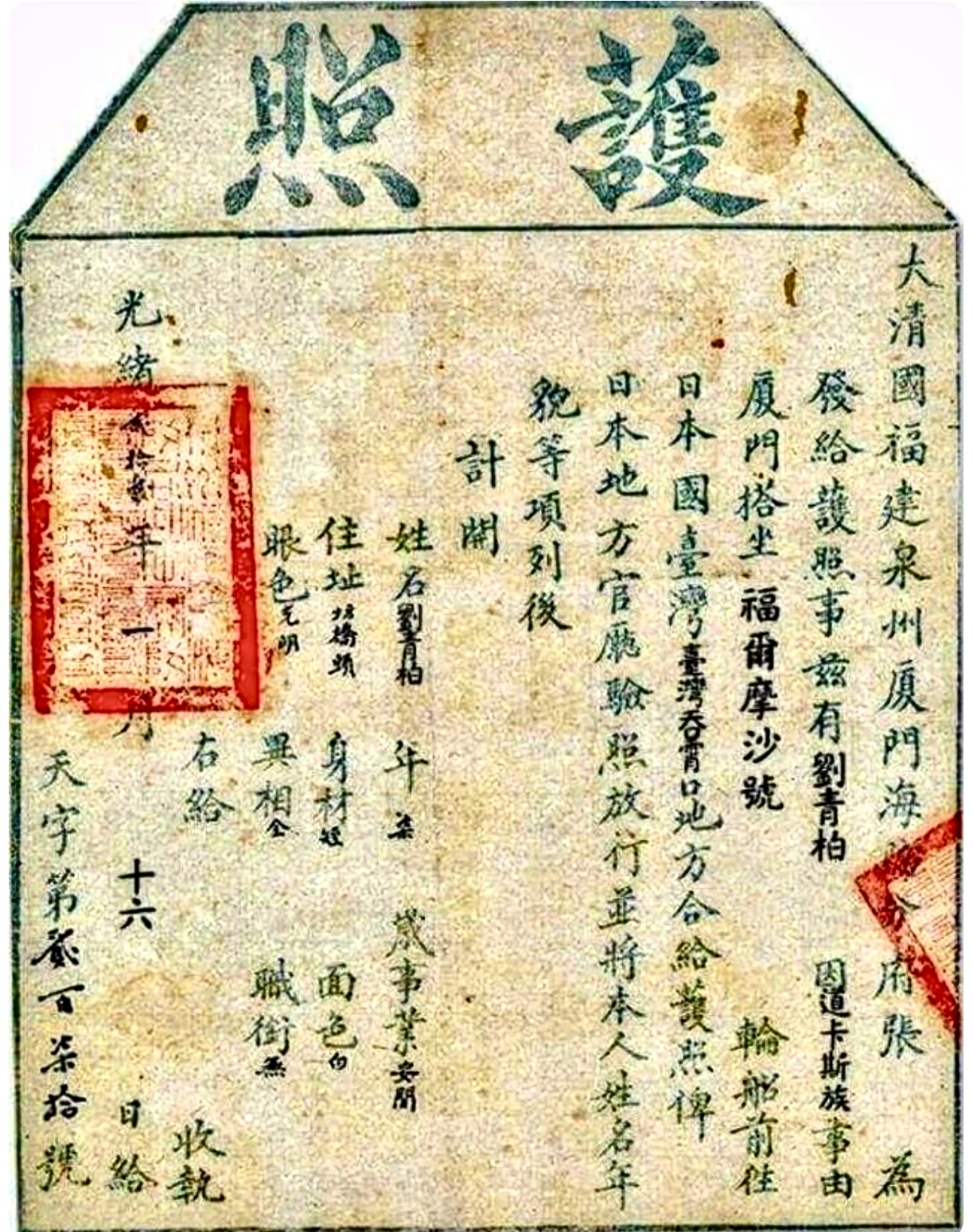 這張光緒二十六(六,?模糊難辨)年間發行的大清護照,該紙本護照為大清國福建泉州廈門海防分府核發,同意一名七歲兒童從廈門搭輪船前往台灣。護照內明確註明旅客個資,包括姓名、年紀、職業、住址,外觀部分則以身材、面色、眼色、有無異相作為辨識依據。清朝護照的尺寸相當大,是現代世界上最大的護照之一,護照上的文字是從上到下、從右到左書寫的繁體中文。