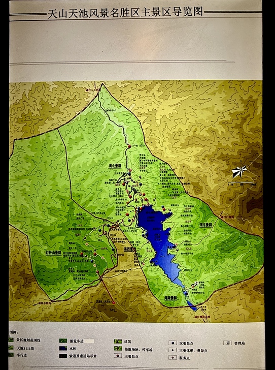 只是時間過於緊促,仍不免還是像走馬觀花一般的走過而已。地理上天池自然保護區的全部景區景點,可分為五區四十景,每區八景,包括:大天池北坡遊覽區、大天池遊覽區、十萬羅漢涅般木山遊覽區、娘娘廟遊覽區和博格達峰北坡遊覽區,其中: