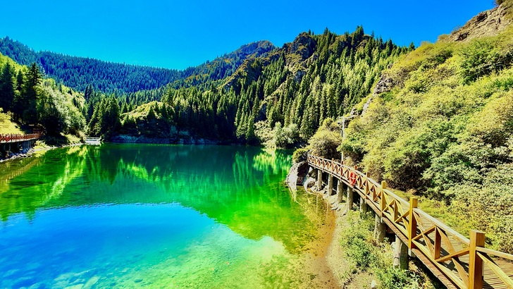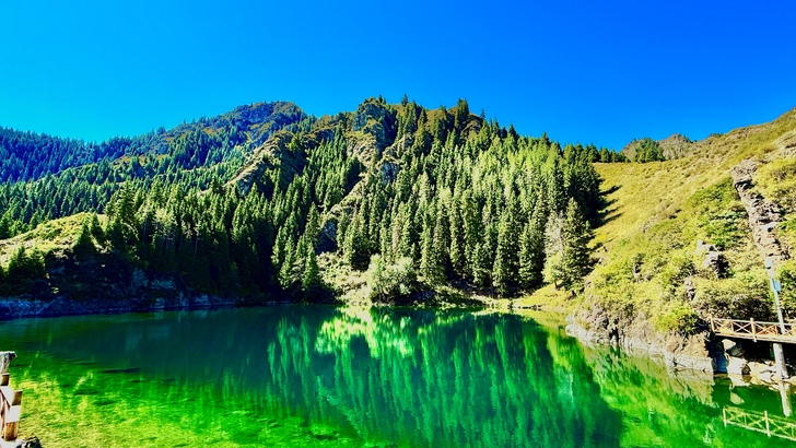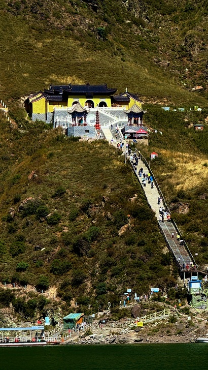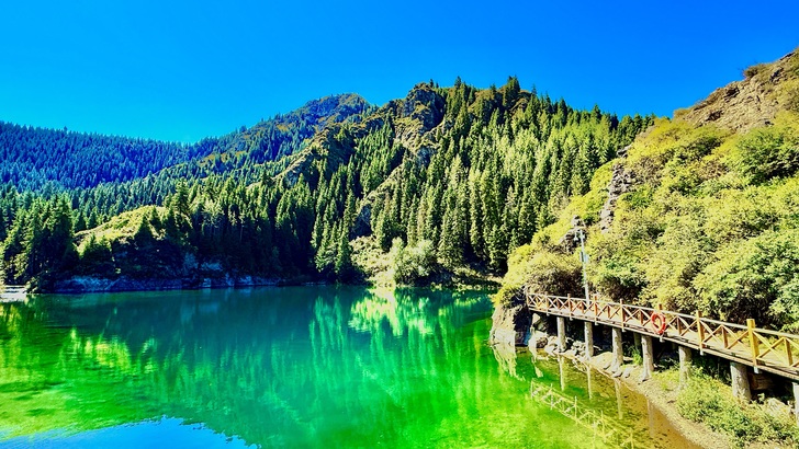 4、天池東岸的「西天王母廟」與傳說:傳說大天池是西天王母娘娘的沐浴之處,兩個小天池是她的梳妝鏡。3000餘年前穆天子曾在天池之畔與西王母歡筵對歌,留下千古佳話,令天池贏得「瑤池」美稱。紀曉嵐烏魯木齊雜詩之風土其三,在梳妝鏡前留下詩句:亂山倒影碧沈沈,十里龍湫萬丈深。一自沈牛答雲雨,飛流不斷到如今。因此天池東岸建有西天王母廟,始建於元朝,供奉著王母娘娘,也稱「娘娘廟」。