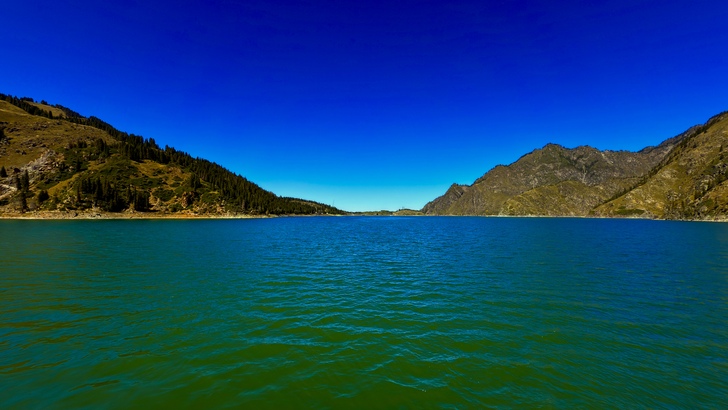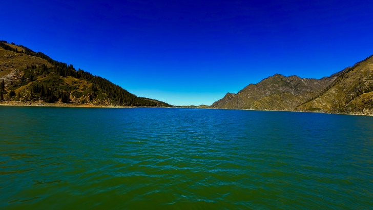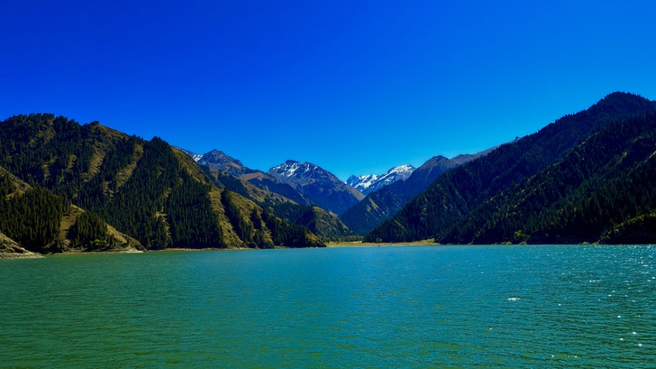 新疆天山天池南北長約3.5公里,東西寬約0.35至1.5公里,面積約4.9平方公里,平均水深60公尺,最大水深105公尺,最大容量2億立方公尺,另有一說:最大蓄水量約為3.86億立方公尺,是按照2024年新疆灌溉供水多65億立方公尺,水庫蓄水多72.1億立方公尺、生態補水多45.8億立方公尺,以水庫來說,多蓄的水大約相當於45個天山天池,由此推得蓄水量。水位年變化幅度為正負7~9公尺,是一個呈半月形的高山湖泊,被稱為「天山明珠」。