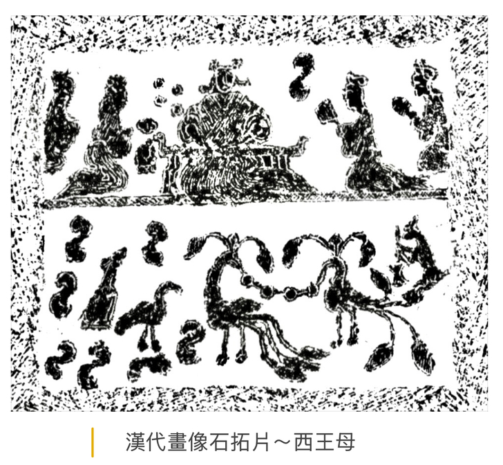 到了漢代,西王母的形象改變了,變成一位美麗的貴婦人,是能夠救災、保佑、賜福的「救世主」。在《漢書》中曾記載西漢末年一場有關西王母崇拜的宗教活動,漢哀帝時,關東因大旱等天災,大批百姓逃難,大家手持「稾」或「棷」(禾苗即未成形的禾稈),相互傳遞,說這是「行西王母詔籌」,據說佩帶西王母的「詔籌」就不會死。這些難民經過二、三十個郡國而抵達長安,並在長安以歌舞等活動祭拜西王母,當時這「繞境」的盛況可不輸臺灣三月的「瘋媽祖」。所以,這位漢代最重要的神仙在漢代畫象石、畫象磚、壁畫、漆器、搖錢樹、銅鏡等器物上都可見到她的倩影,她的身旁還常會出現服侍她的九尾狐、三足烏、蟾蜍、玉兔和羽人等。
