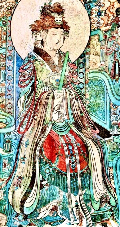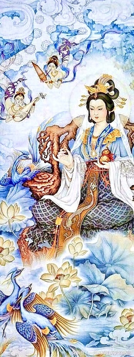 據《山海經·西山經》載,西王母居「玉山」,形似人形、豹尾虎齒,掌管災疫刑罰,早期形象帶有原始圖騰色彩。天池被後世附會為西王母的居住地。