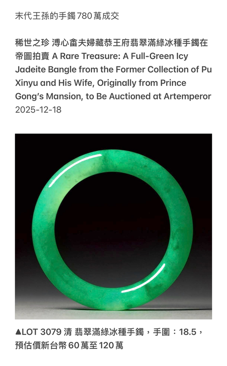 2025.12.28在台北帝圖拍賣的溥心畬夫人李墨雲佩戴的翡翠手鐲,是首次公開於市場。從新台幣60萬元起拍,最終以780萬落槌。